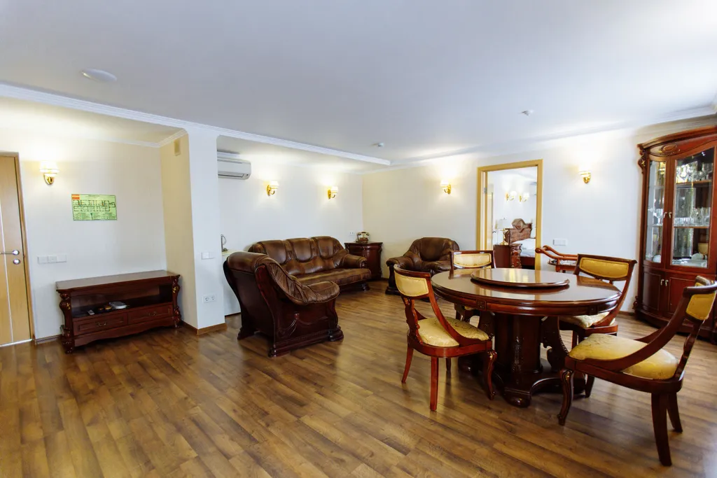 Трёхкомнатный номер 98,6 кв. м., 2 спальни, 1 общий зал. Располагает удобной современной мебелью: шкафом для одежды, комодами, двумя двуспальными кроватями «king size», кожаными диваном и двумя креслами, прикроватными тумбочками, обеденный стол и четыре стула, два столика с зеркалом и стульями.