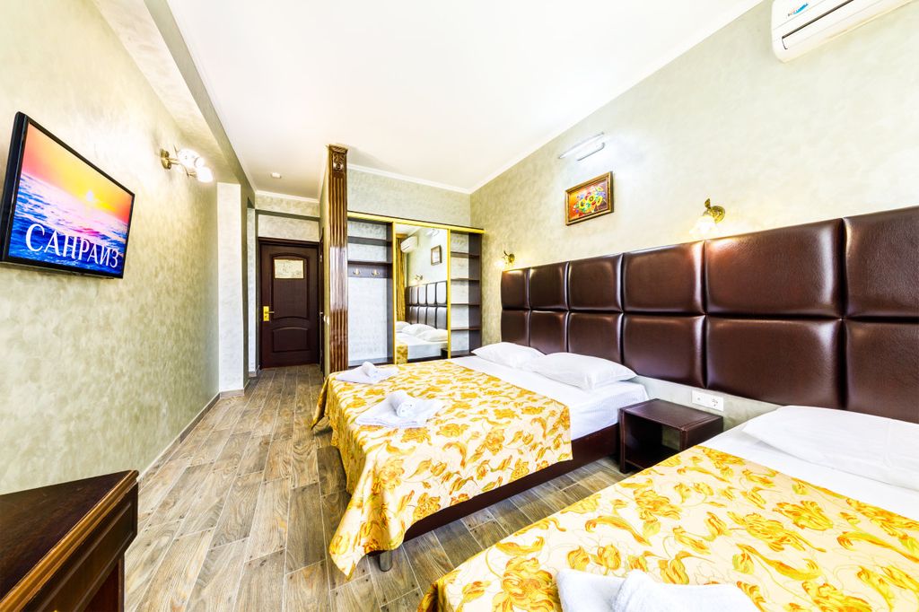 Гостиница Санрайз расположена в селе Витязево. Здесь созданы все условия для комфортного проживания — есть частный пляж, теплый бассейн, анимации и мультфильмы для детей. Номера оборудованы кондиционером, холодильником, телевизором и феном. Предложены варианты размещения с и без балкона. В гостинице около 48 номеров — можно выбрать любой понравившийся и узнать подробнее, что в нём. По запросу предоставляются номера для некурящих. В гостинице есть столовая, ресторан и бар. И вы наверняка захотите отдохнуть у бассейна — он тут тоже есть. Причём открытый, с подогревом. Пляж тут близко — до него всего 550 м, а далее вас будет ожидать закрытая оборудованная территоия. У каждого гостя будет доступ в интернет, вы сможете выложить фотографии, отправить файл или позвонить родным по видео. Учитывайте время заселения в гостиницу. Заезд здесь начинается с 13:00, выехать нужно до 11:00. Даже если вы прибудете поздно ночью, вас встретят на круглосуточной стойке регистрации и помогут с размещением.