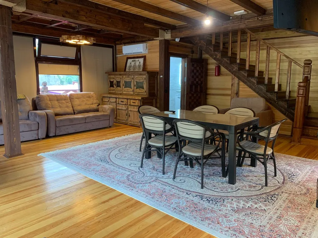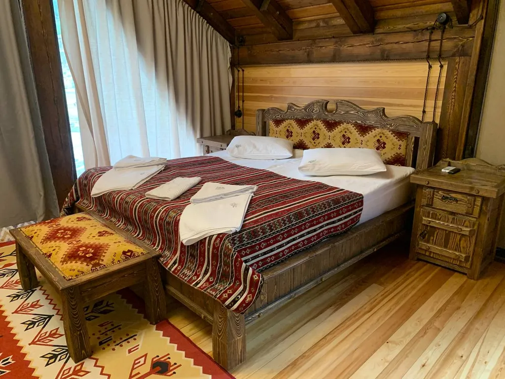 Просторный оформленный в национальном стиле трёхкомнатный коттедж с двумя спальнями с двуспальными кроватями и гостиной с двумя двухместными раскладными диванами. С террасой.