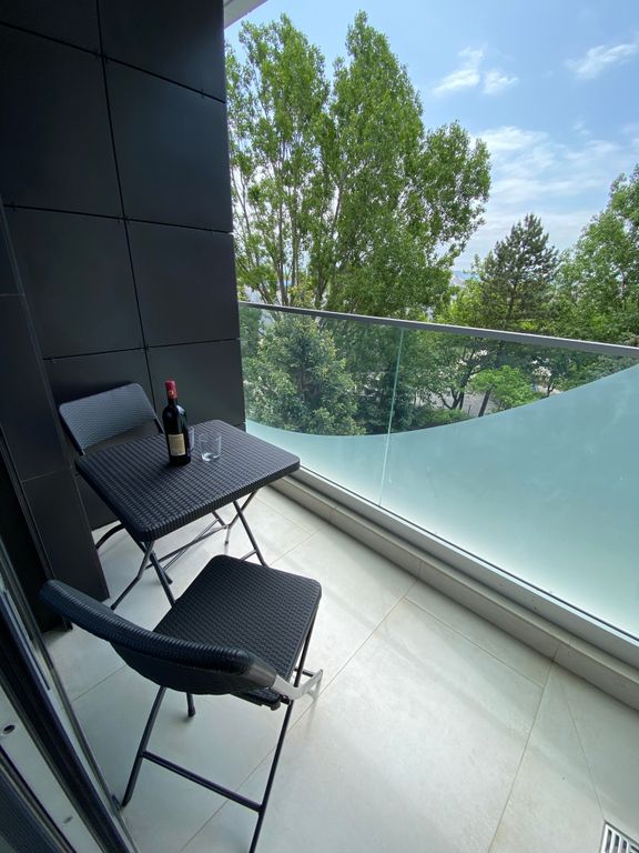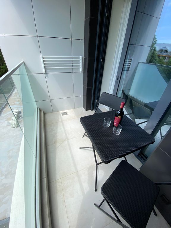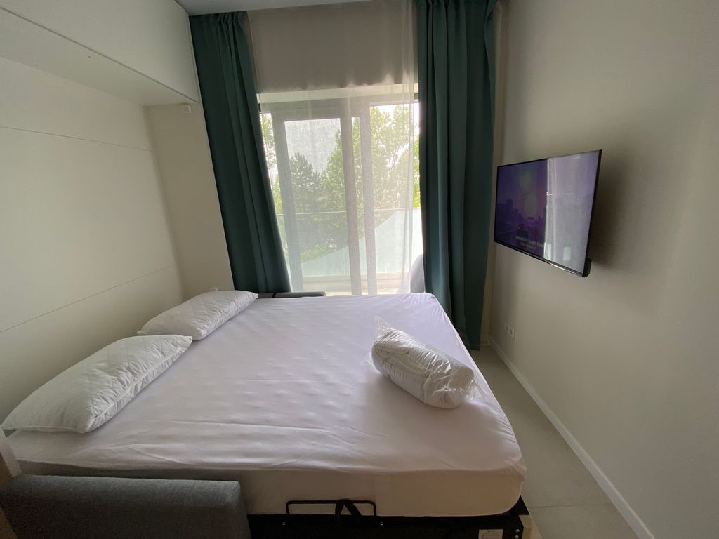 Вторая линия. До моря 5 минут, имеется свой собственный оборудованный пляж с шезлонгами. На территории отеля зелёное прогулочные зона, детская и спортивные площадки. В номере есть все необходимое: чайник, фен, утюг, полотенце, плита, посуда, постельное, халаты, микроволновка, холодильник, телевизор, интернет, кондиционер, стиральная машина. Балкон с видом на зелёный парк. На территории отеля имеется бассейн взрослый и детский и ресторан.