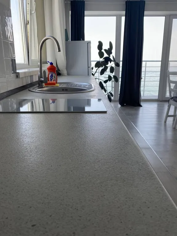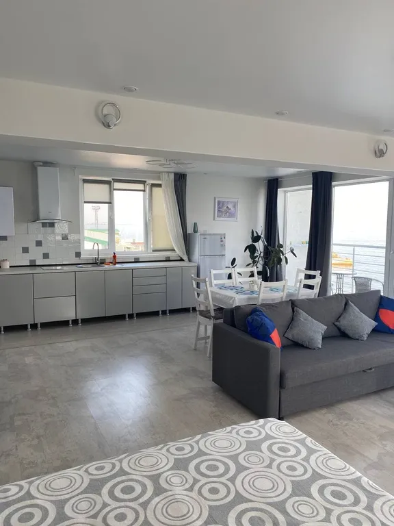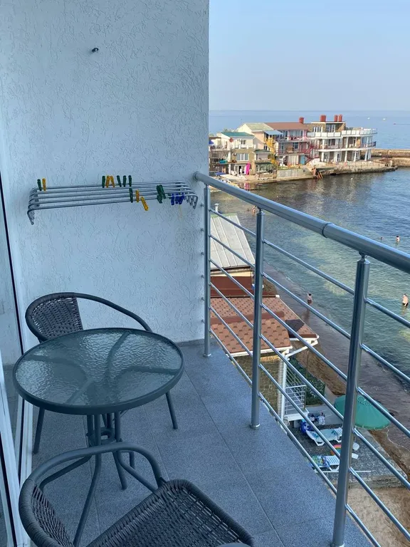 Роскошные апартаменты с балконом и потрясающим видом на феодосийский залив, жилой массив, а также гору паша́-тепе́ состоящие из встроенной кухни, обеденной зоны, спальной зоны и ванной. Идеально подходит для длительного проживания. В апартаментах находится удобный диван (легко трансформируется в кровать) кресло-кровать, двуспальная кровать, чайник, кухонные принадлежности, стиральная машинка, гладильные принадлежности, кондиционер, холодильник, бесплатный wifi. В ванной комнате: душ, туалет, гигиенические принадлежности, тапочки. Апартаменты расположены на пятом этаже.