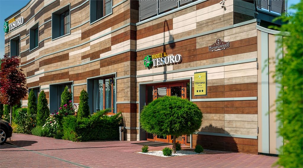 Фешенебельный отель «Tesoro» находится в городе Ростов-На-Дону. К вашим услугам здесь достойный уровень обслуживания. Интерьер апартаментов оформлен в изысканном стиле, в цветовой гамме преобладают коричневые оттенки тонов, которые создают атмосферу покоя и уюта. Все номера имеют необходимую для проживания мебель и технику, а из некоторых открывается замечательный вид на сад. Приём постояльцев происходит круглосуточно. К прочим преимуществам сервиса относятся: бесплатный интернет, телевизор, собственная ванная, гостиный угол, терраса, кондиционер, сейф, частная парковка для автомобилей, камера хранения багажа, люкс для новобрачных, ежедневная уборка, номера для некурящих людей и семейных пар. Для детей предусмотрены игровые комнаты и зоны, а также телеканалы. Каждое утро гостей угощают континентальным завтраком. Действуют специальные диетические меню, доставка еды и продуктов. Рядом расположены памятник дающая жизнь, автовокзал, стадион, концертный зал дом офицеров, расстояние до ме