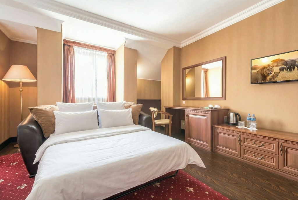 Российским гражданам при заезде обязательно нужно иметь оригинал действующего паспорта РФ. Для всех детей до 14 лет должны быть предъявлены свидетельства о рождении. Если ребёнок путешествует с родственником, за исключением родителей или опекуна, при заезде должны быть также предъявлены документы, подтверждающие его право сопровождать ребёнка. Граждане иностранных государств: при заезде взрослые и дети должны предъявить действительные паспорт, визу и миграционную карту. Гости могут заказать дополнительные спальные места: Плата за раскладное кресло или раскладной диван для ребёнка до 10 лет: 600.00 rub за ночь; Плата за раскладное кресло или раскладной диван для ребёнка до 18 лет: 800.00 rub за ночь; Плата за раскладное кресло или раскладной диван для взрослого: 1000.00 rub за ночь; Завтрак подаётся в номер в трёх вариантах на выбор: 1. Вариант: круассан (на выбор) + кофе/сок/чай (на выбор) + сезонные фрукты/ягоды + стакан воды. 2. Вариант: гранола с молоком + блинчики (на выб