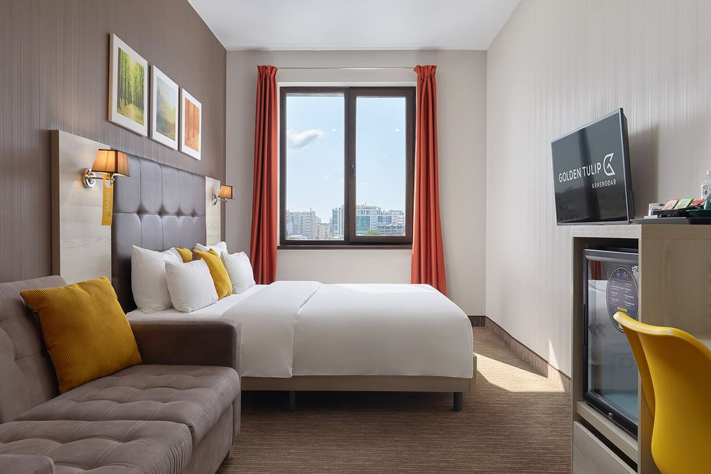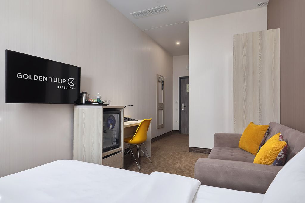 В Центральном районе города Краснодар находится большой и современный отель "Golden Tulip Krasnodar". К услугам гостей предоставляется место на автомобильной парковке и беспроводной доступ в интернет. По согласованию с администратором возможно проживание с домашними животными. В номерах ежедневно проводится уборка. Интерьер номерного фонда выполнен в светлых классических тонах. Передохнуть после тяжелого трудового дня можно в общей зоне отдыха на мягких диванах за просмотром интересного фильма. По утрам в отеле сервируется сытный и вкусный завтрак. В ресторане "Джентльмены удачи" предлагается отведать блюда местной, европейской и русской кухни. По запросу осуществляется доставка еды и напитков в номер. Активным отдыхающим предлагается воспользоваться услугами фитнес-центра и сауны. Крупный багаж можно оставить в камере хранения. Дорога в пути до аэропорта занимает примерно один час времени.