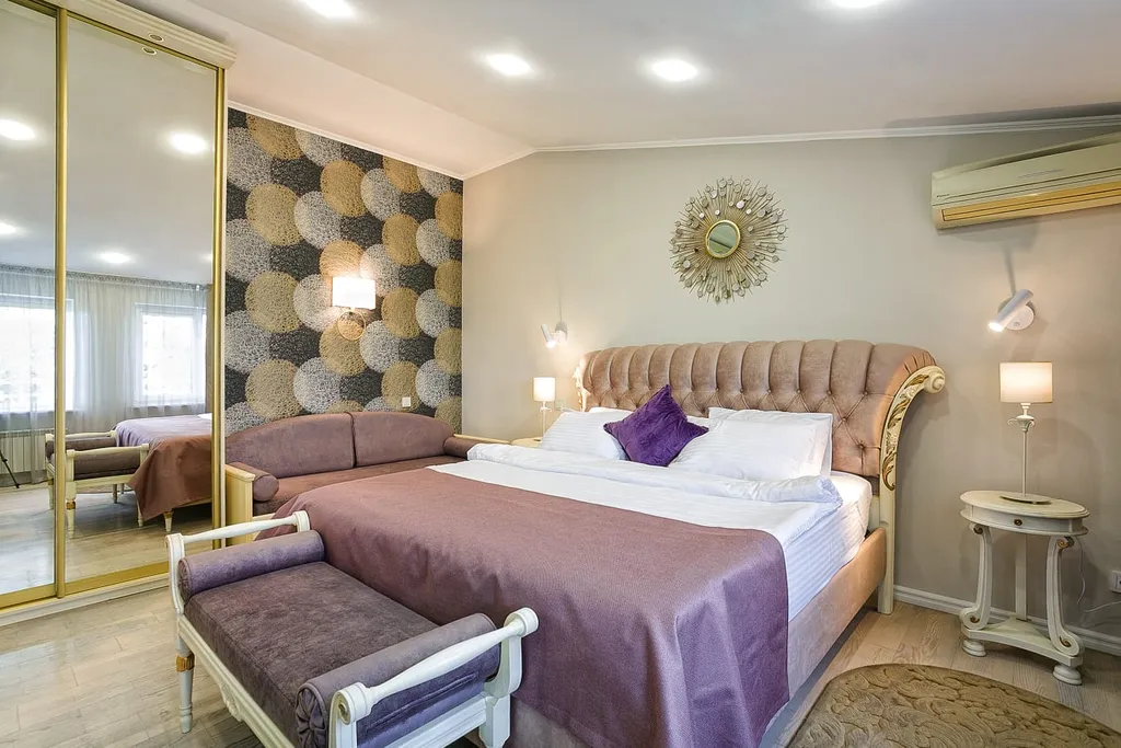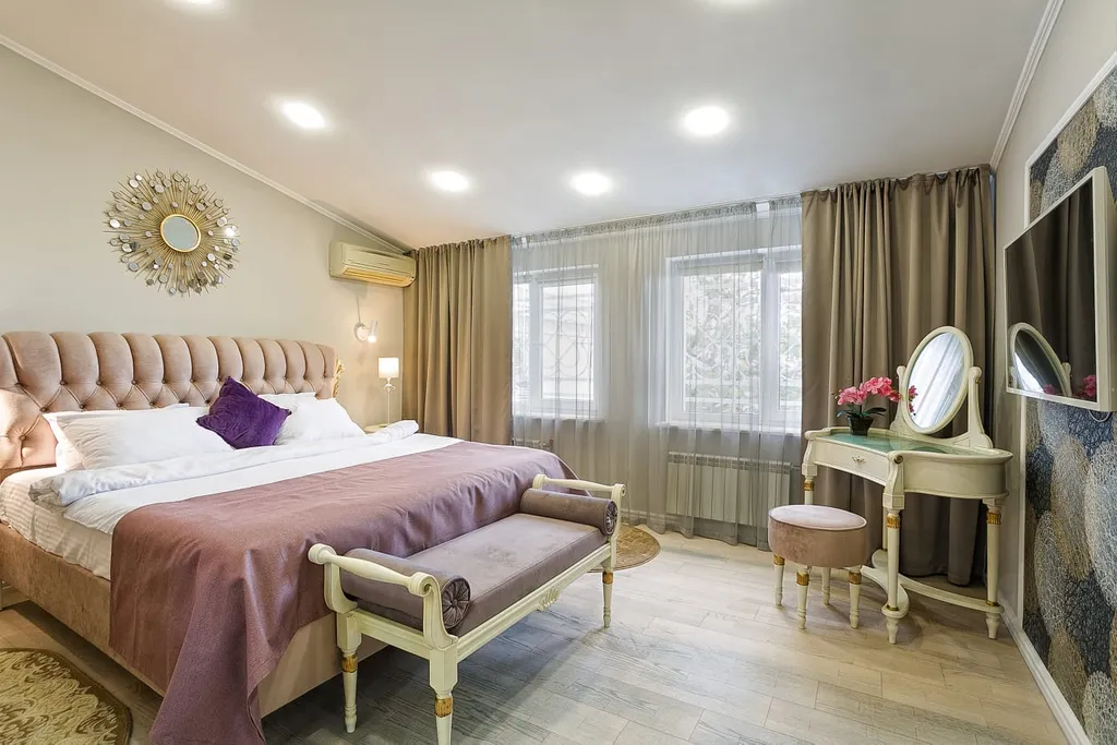 Двухкомнатные апартаменты с видом на море, без балкона, состоят из просторной прихожей, гостиной-студии с камином из мрамора, изолированной спальни. В ванной есть биде, теплый пол и стиральная машина. Максимальное число гостей -4 человека. В номере 2 телевизора, 2 кондиционера, кухня, посуда, свч, эл. Чайник, утюг, фен, сейф. Выполнен дизайнерский ремонт. На территории отеля есть кафе и ресторан.
