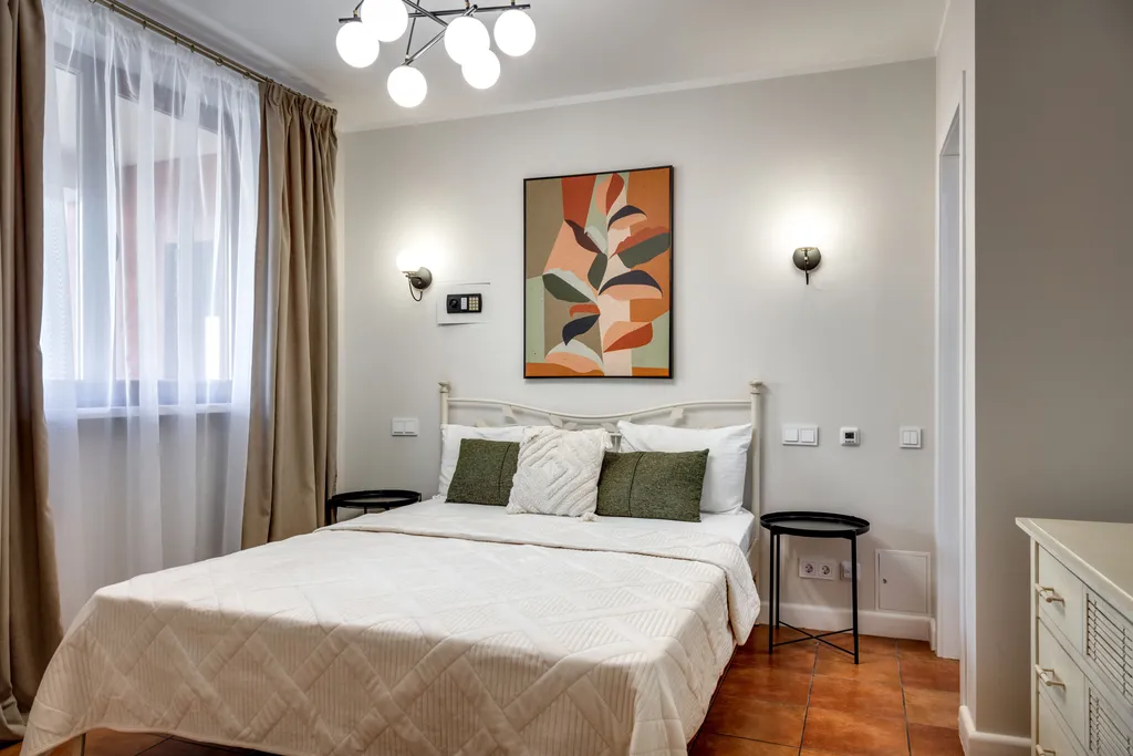 Апартаменты в комплексе Фамилия Делюкс Эти апартаменты идеально подойдут для отдыха семьи или компании из 6 человек, расположены на 5 этаже, состоят из двух спален и гостиной, с двумя санузлами. Комплектация апартаментов отвечает самым высоким требованиям (Smart TV, бесплатный WI-FI, кондиционеры, холодильник, посудомоечная машина, духовка, стиральная машина, гладильные принадлежности, постельное белье, полотенца, балкон с летней мебелью, фен, пылесос, бытовая химия, посуда для приготовления и приема пищи, отопление). Просторный балкон оснащен летней мебелью. Спальные места: одна двуспальная кровать, две односпальных кровати, диван на одного человека. Доп. место возможно на 1 чел. (раскладушка). В непосредственной близи с комплексом находится большой супермаркет с продуктами, а также несколько кафе и ресторанов.