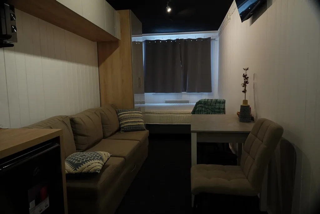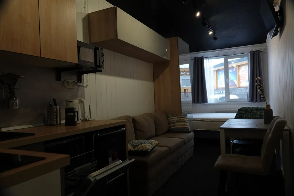 Апартаменты площадью 28 кв. м с видом на горы. Подходит для размещения 5 человек (4 основных места и 1 дополнительное). Имеет гостиную и спальню с приятным интерьером. В номере: 2 двуспальные или 4 односпальные кровати, 1 односпальный диван. Имеется терраса, сейф, телевизор, кондиционер, шкаф, вешалка, зеркало, стол обеденный, кухня, посуда, столовые приборы, СВЧ, чайник, плита электрическая, холодильник, стулья, стиральная машина и сушилка для белья. Индивидуальная ванная комната: душ, раковина, туалет. В стоимость входит: постельное бельё, полотенца, мыло, тапочки, фен и ванные принадлежности. Wi-Fi бесплатно на всей территории. Бесплатная общественная парковка на территории.