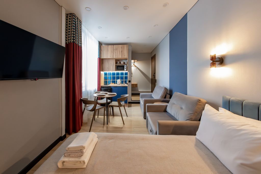 Апарт-отель spot80 на лево-булачной — место, где начинаются яркие истории. Из окон открывается шикарный вид на центр города: кремль, канал булак и живописное озеро кабан. Здесь можно выпить кофе и любоваться закатом, а вечером огни создают настоящую магию большого города. В 600 метрах станция метро, магазин продуктов и остановка общественного транспорта в 1-3мин пешком. Современные и функциональные апартаменты, вместимостью от 1 до 4 гостей. В каждом номере: — ортопедический матрас — мини-кухня: посуда: тарелки, приборы, кастрюли, сковородки, салатник, кухонная утварь, чайник, плита, микроволновка — холодильник — жидкое мыло, гель для душа + шампунь для волос, кондиционер для волос — зубной набор — одноразовые тапочки — полотенца для рук/ног, банные — телевизор smart tv — кондиционер — фен — шторы — бесплатный гостевой wi-fi — умный электронный замок — стиральная машина — горячее водоснабжение через электроводонагреватель (бойлер) — отпариватель для одежды — душевые кабины Дополните