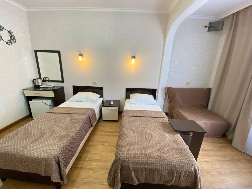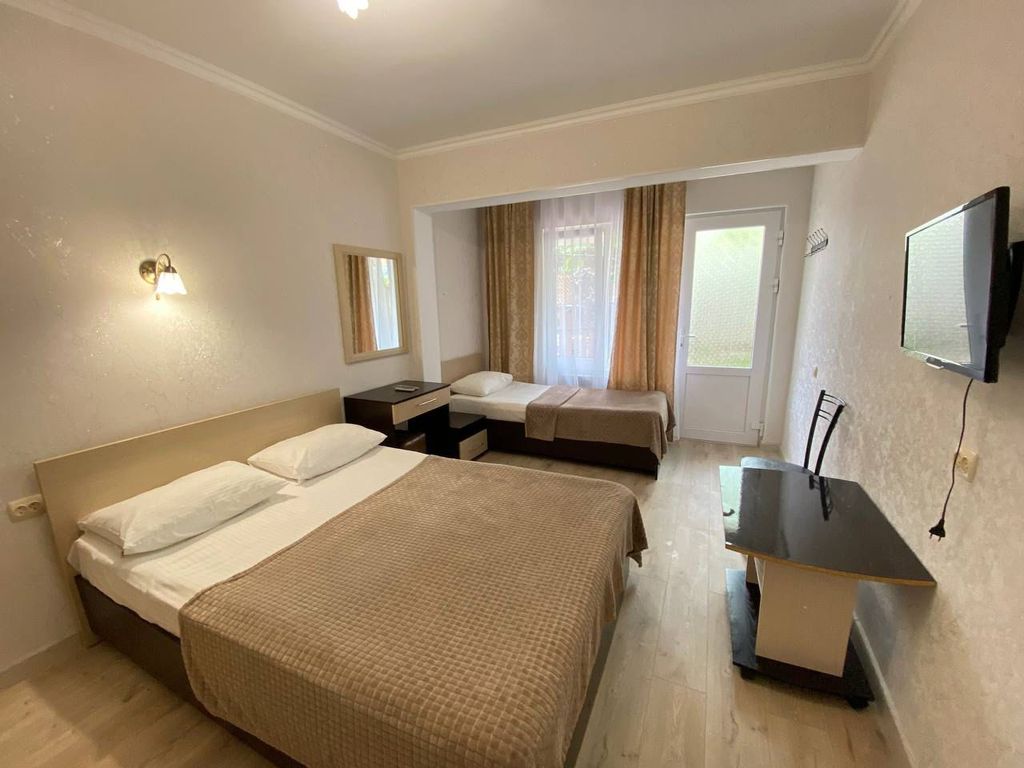 Гостевой дом «Ромашка» Гостевой дом «Ромашка» — это уютное и спокойное место для комфортного отдыха в тёплой курортной атмосфере. Территория утопает в зелени: пальмы, декоративные растения и ухоженный двор создают ощущение уюта и уединения уже с первых минут пребывания. Здание выполнено в светлых, солнечных тонах, с аккуратными балконами и галереями, что придаёт гостевому дому приятный и ухоженный внешний вид. Закрытая территория обеспечивает комфорт и безопасность гостей. Во дворе — просторная зона для отдыха, вымощенные дорожки, зелёные насаждения и тихие уголки, где приятно провести время днём или вечером. Атмосфера располагает к спокойному отдыху вдали от городского шума. Номера расположены в галерейном корпусе, каждый номер имеет отдельный вход, что особенно удобно для семей и гостей, ценящих личное пространство. Светлые интерьеры, аккуратная мебель и продуманная планировка создают комфортные условия для проживания. Гостевой дом «Ромашка» подойдёт для: семейного отдыха спокойного
