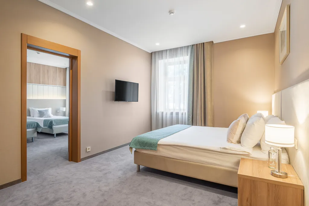 Самый большой номер нашего отеля имеет площадь 60 кв. М и четыре основных места для размещения (кровать king-size и две полутороспальные кровати). В номере две спальни в нежной пастельной цветовой гамме и две ванные комнаты. Настоящий отдых для глаз и души. Один ребёнок до 6 лет бесплатно без предоставления отдельного спального места. С 6 лет дети размещаются на дополнительном спальном месте, стоимость 1500 руб. /сут. С завтраком. Размещение с животными запрещено.