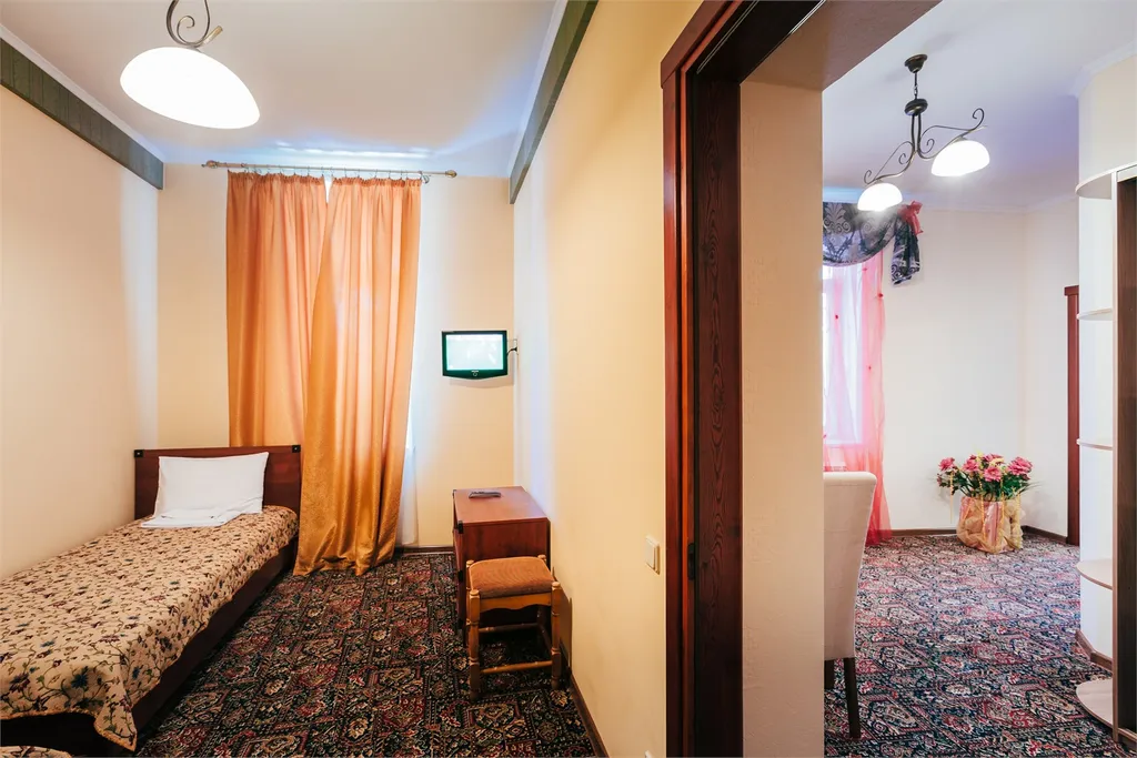Бесплатные и платные услуги В цену включены завтрак (комплексный), организация регистрации, предоставление документов для отчетности, смена постельного белья, постельное белье для всех гостей, уборка. Можно приобрести за дополнительную плату трансфер от ж/д вокзала, трансфер до ж/д вокзала, трансфер из аэропорта, трансфер в аэропорт, прокат велосипедов, услуги экскурсовода, парковка, пользование стиральной машиной. Один ребёнок до 2 года — можно без отдельного спального места. Площадь двухкомнатного номера – 48 квадратных метров – обеспечит гостям простор, свободу и настоящий комфорт. Удобная двуспальная кровать, прикроватные тумбы, туалетный столик, удобные мягкие стулья с высокими спинками, кондиционер, LED-телевизор… Здесь так приятно восстанавливать силы после пляжного и другого активного отдыха. Для детей – отдельная спальня, в которой две односпальных кровати, комод и свой телевизор. Комната между двумя спальнями разделена на две зоны: обеденная (стол из натуральной древесины, м