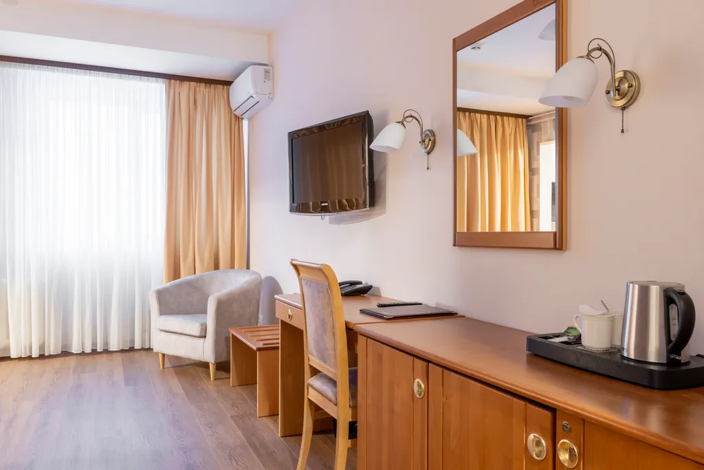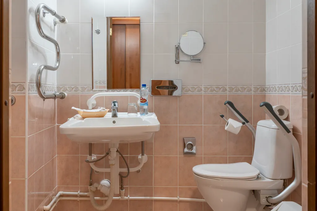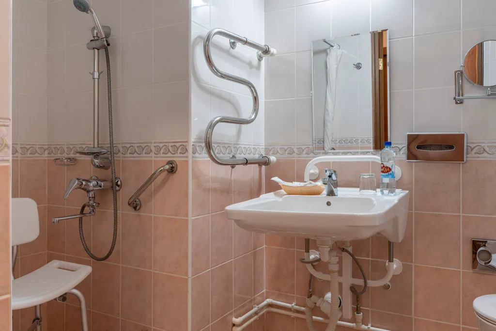 Мы заботимся обо всех гостях, поэтому предлагаем особый номер «Полулюкс для людей с ограниченными возможностями». Номер состоит из спальни с большой двуспальной кроватью (210*220), гостиной и ванной комнаты. Есть возможность разместить дополнительное спальное место (за дополнительную плату). Данный номер имеет ряд особенностей, начинающихся с двери – отсутствуют пороги, расширены дверные проемы. Возле кровати имеется зона для разворота кресла на 360 градусов. В ванной комнате предусмотрено низкое расположение раковины, установлены поручни возле туалета, душ с насадкой для многоуровневой фиксации. Все банные принадлежности расположены на уровне коляски. Ванная комната и спальня оборудованы тревожными кнопками. Дети до 5 лет, без предоставления дополнительного места, размещаются бесплатно! Тренажёрный зал круглосуточно и бесплатно! Спа-комплекс за дополнительную плату.