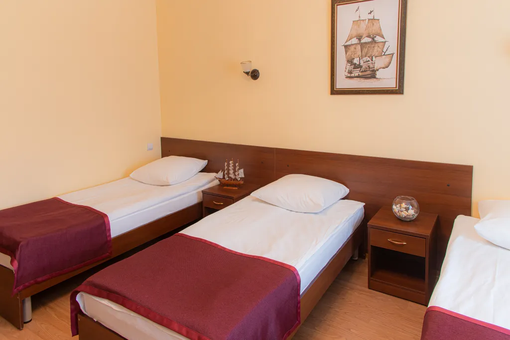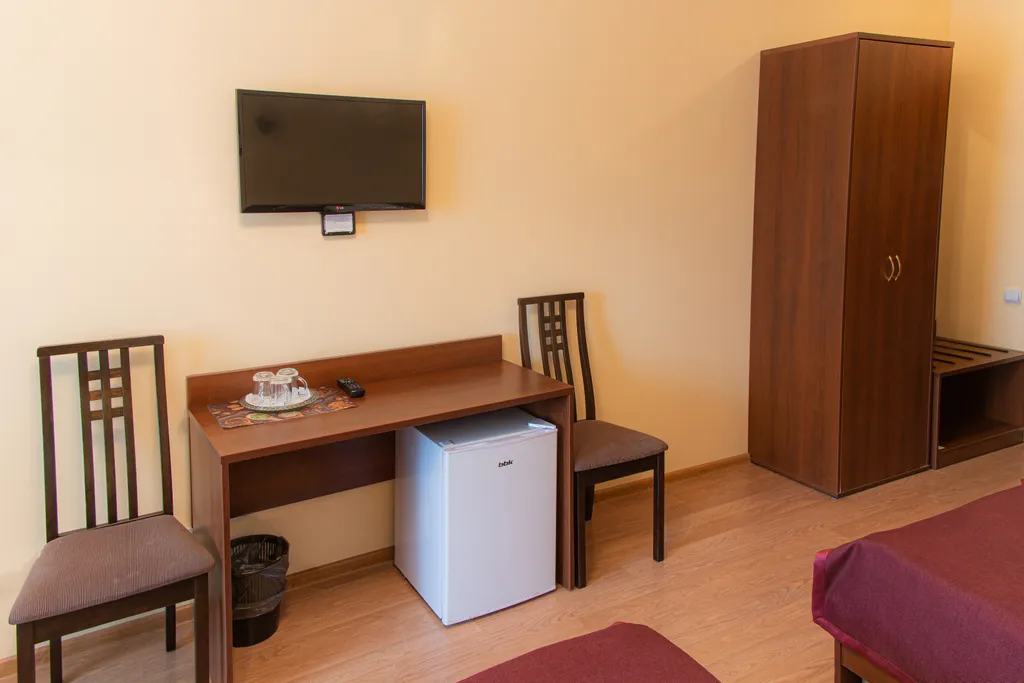 Просторный номер, укомплектован всем, что нужно для комфортного отдыха. Подходит как для семьи так и для компании от 2 до 4 человек. Сан узел в номере; полотенца, фен, одноразовая косметика предоставлены. В комнате мини холодильник, кондиционер. чайник предоставляется по запросу за символическую плату, в подарок - чайный набор на 2 персоны. В шаговой досупности магазины, рестораны, остановки общественного транспорта в любое направление города