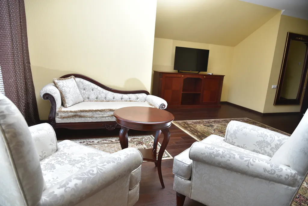 Общая площадь номера составляет 54,5 кв.м. Номер состоит из большой спальни со спальным местом и мягкой зоной, Большая ванная комната с душем и ванной и всеми необходимыми принадлежностями Дополнительное место предоставляется в виде раскладушки. Возможно размещение одного ребенка до 2 лет бесплатно без предоставления дополнительного спального места.