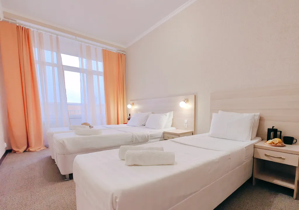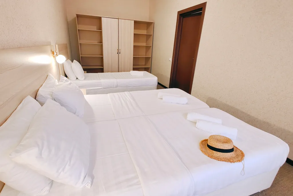 Двухкомнатный 5-ти местный номер с балконом. Первая спальня оснащена: двуспальная кровать и односпальная кровать или три односпальные кровати, прикроватные тумбочки, прикроватные бра, большой шкаф. Вторая спальня: двуспальная кровать или две односпальные, письменный стол, шкаф, ТВ, мини-холодильник, кондиционер. На балконе имеется мебель для отдыха. Ванная комната: душ, туалет, раковина, фен.