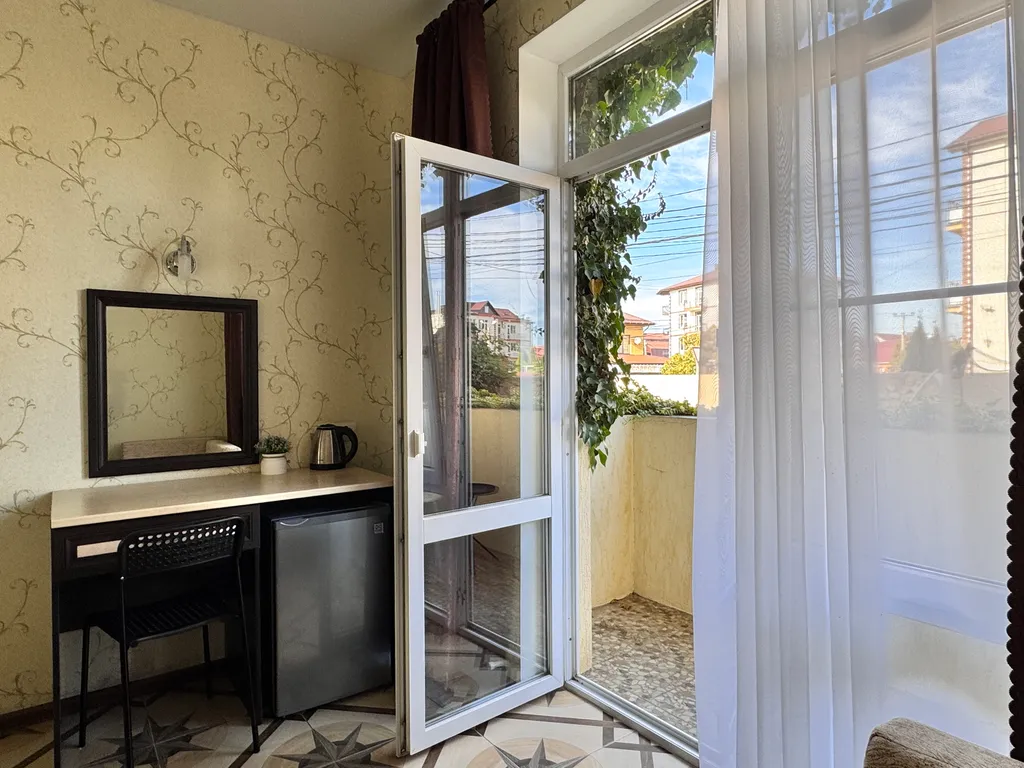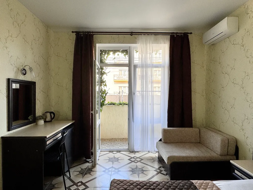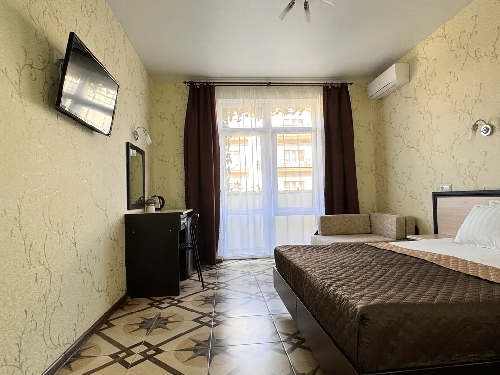 3-х местный комфорт. В номере все необходимое для удобного размещения: 2-х спальная кровать, кресло-кровать (80х120), шкаф, журнальный столик, зеркало, телевизор, кондиционер, мини-холодильник, чайник, своя ванная комната с душевой кабинкой. Балкон. Один ребенок до 5 лет может проживать бесплатно без предоставления спального места.