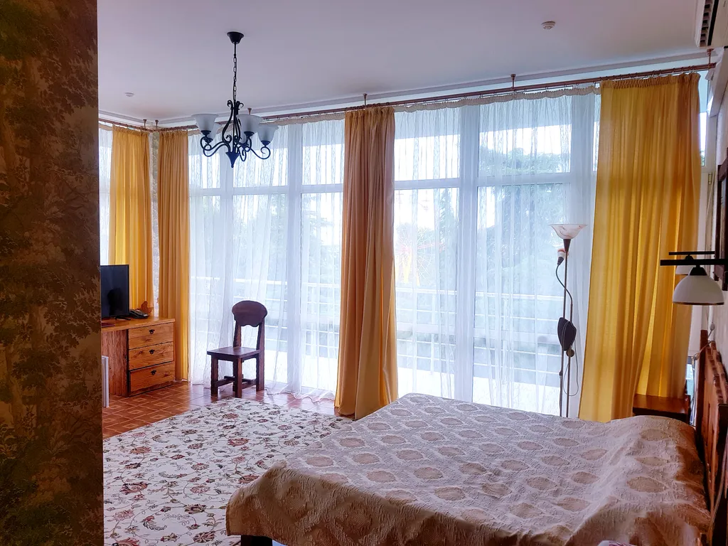 Просторный номер (31 кв м) с полным набором удобств для вашего комфорта. Ванная комната: совмещенный санузел с ванной, укомплектованный всем необходимым: мягкие тапочки, туалетные принадлежности, фен и два уютных халата. Спальня/гостиная: удобная двуспальная кровать (180х200 см), вместительный шкаф для одежды, журнальный столик, прикроватные тумбы, а также рабочий стол со стулом. Оснащение: для вашего удобства предусмотрены посуда, электрочайник, персональный сейф, холодильник, телефон, современный lcd телевизор и кондиционер. В номере также есть гладильные принадлежности. Балкон: приватный балкон с мебелью, где можно насладиться свежим воздухом. Вид: из окна открывается живописный вид на парк и частичный вид на море.