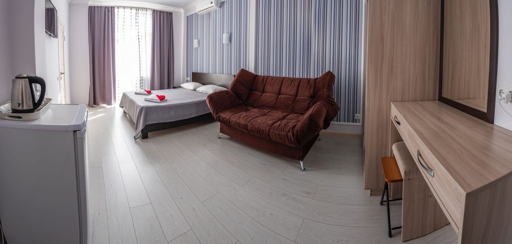 Отель "Вилла Мира" расположен в тихом курортном районе Алушты. Море и пляж находятся всего в нескольких минутах ходьбы. В 500 метрах от нас есть продуктовый магазин. До городской набережной Алушты можно доехать на электрокарах. У отеля есть собственная крытая стоянка для машин, расположенная непосредственно возле отеля и находящаяся под видеонаблюдением. На крыше второго корпуса отеля находится зона отдыха + смотровая площадка. Там Вы сможете отдохнуть в гамаках, позагорать на шезлонгах, посмотреть телевизор, поиграть в настольный теннис. Также на территории зоны отдыха есть бар и мангал, где для Вас могут пожарить вкуснейшее мясо. Ваши дети тоже останутся довольны, так как в их распоряжении будет детский уголок и PlayStation4. И все это с видом на море. В нашем отеле есть кафе, в котором Вы сможете всегда вкусно и недорого покушать. Во всех номерах есть душ, туалет, электрический чайник, сейф, фен, холодильник, плоский телевизор, кондиционер, набор личной посуды. Из некоторы