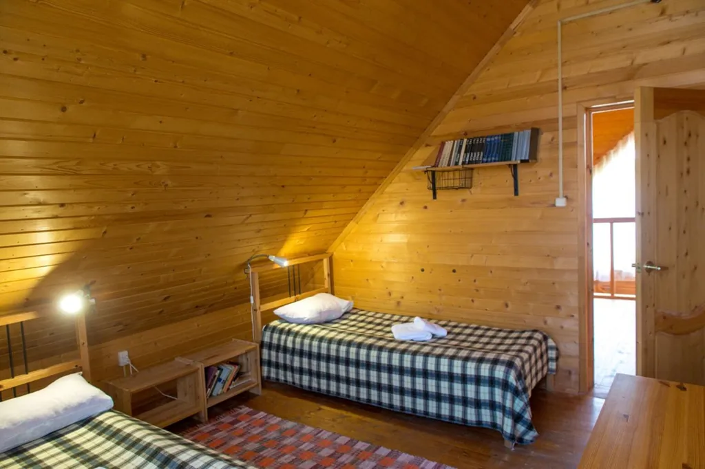 Допускается размещение с животными, стоимость 500 р в сутки вес до 10 кг. Двухэтажный коттедж. На 1-ом этаже: совмещенный с/у, две спальни с двухместным размещением, кухня- гостиная с диван- кроватью. На 2-ом этаже: с/у, две спальни с трехместным размещением (двуспальная и односпальная кровати), одна спальня с одноместным размещением.