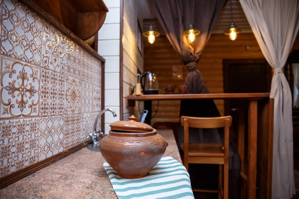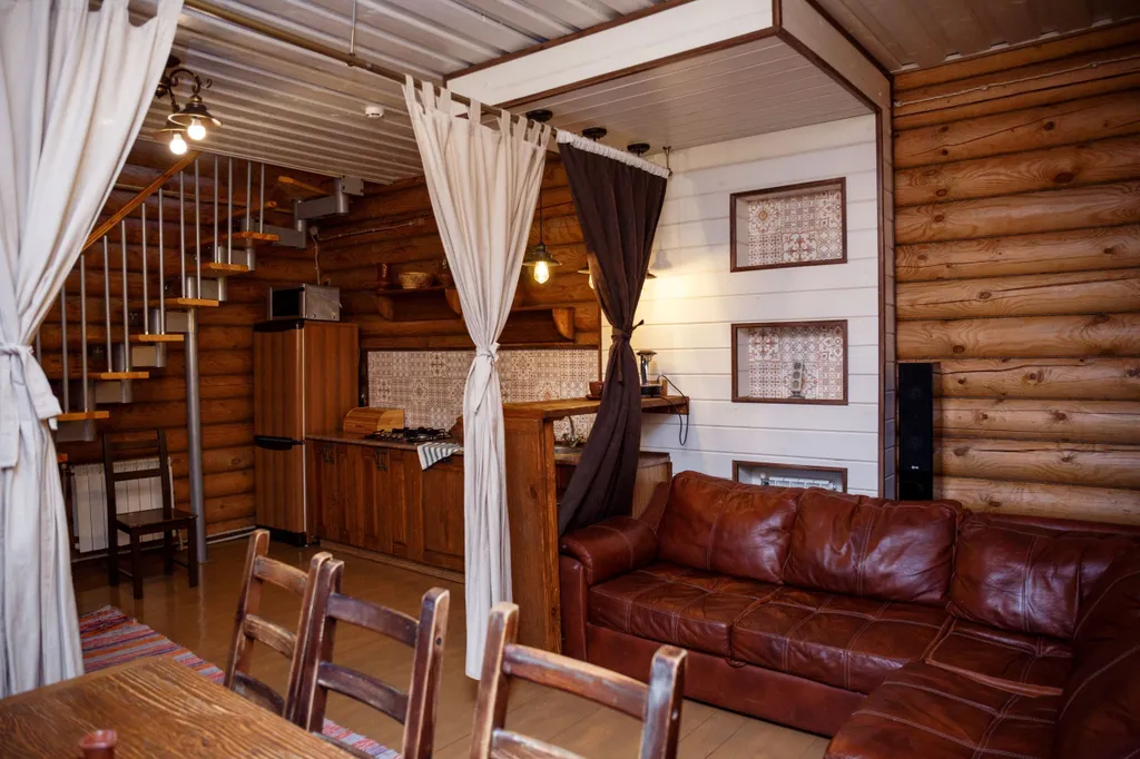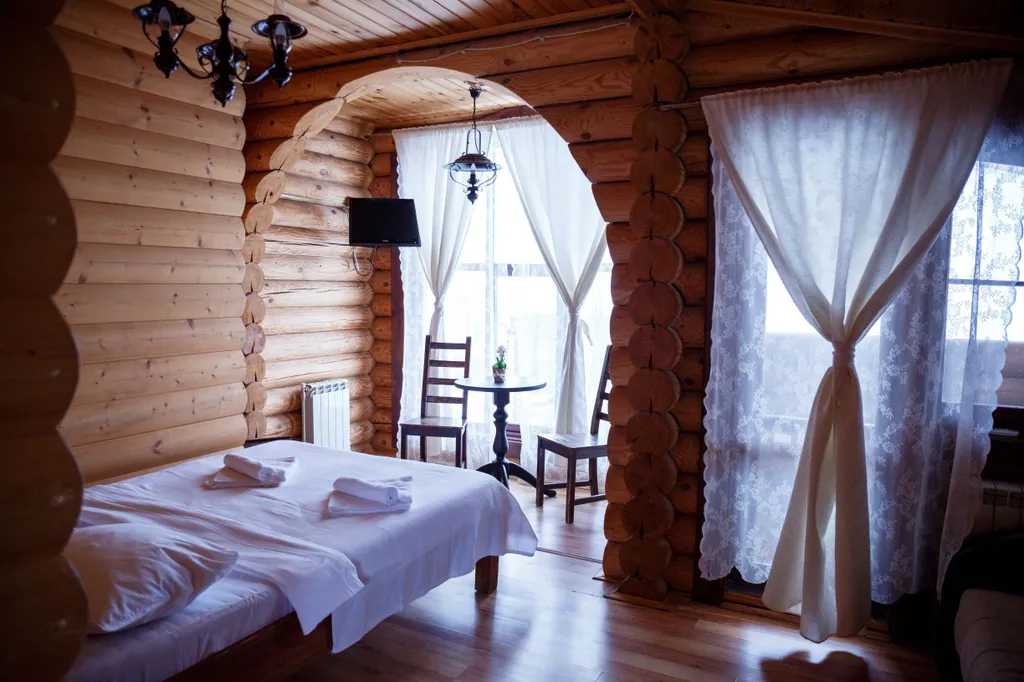 Двухэтажный, деревянный дом с баней. Первый этаж: Просторная комната отдыха, разделённая на несколько зон: гостиную с диваном, столовую с телевизором и укомплектованную кухню, отделённую барной стойкой. Баня - парная вместимостью до десяти человек, душевая с «обливным» устройством. Второй этаж:«Горница» - большой двухместный номер люкс с двуспальной кроватью, удобствами и балконом. «Светлица» - двухместный номер с большой двуспальной кроватью, удобствами и балконом. На террасе летний бассейн.