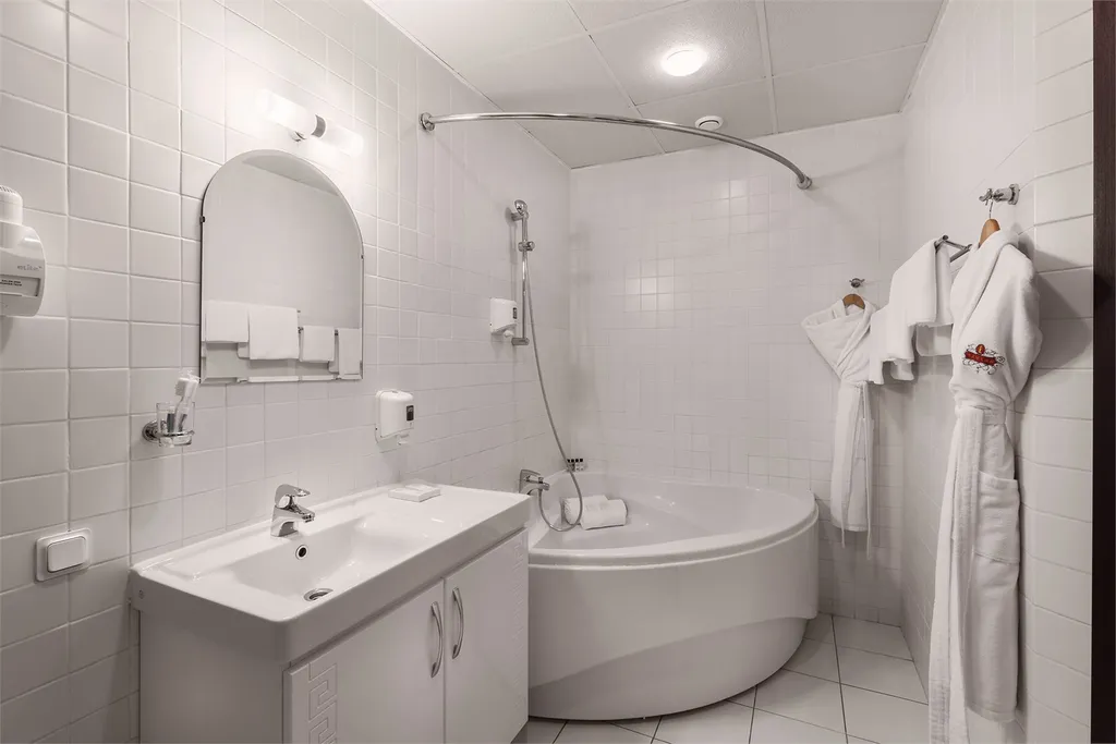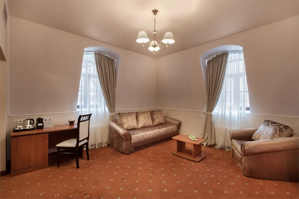 Просторный однокомнатный номер общей площадью 50 кв.м. предоставляет отличные возможности для приятного отдыха и решения деловых вопросов. Оригинальные окна «мансардного типа» на 3 этаже придают люксам дополнительный комфорт и уют. Дополнительно предоставляется завтрак (шведский стол), стоимость 1250 руб. /чел. Дети 4-х лет размещаются бесплатно без предоставления дополнительного спального места. Возможно размещение с животными (только собаки, стоимость размещения 1800 руб.\сутки).
