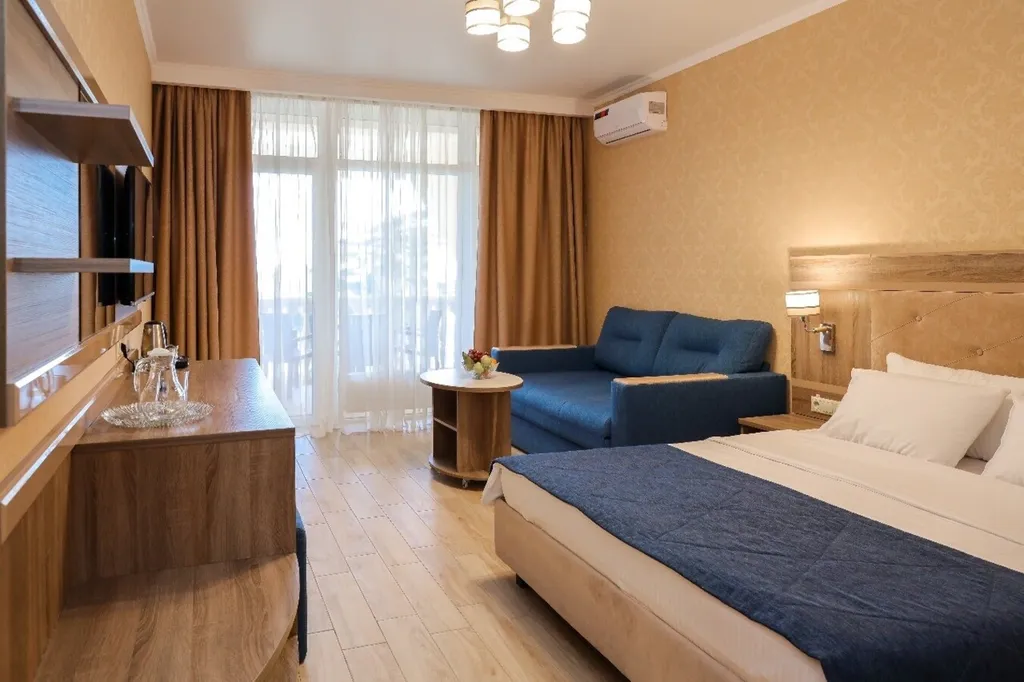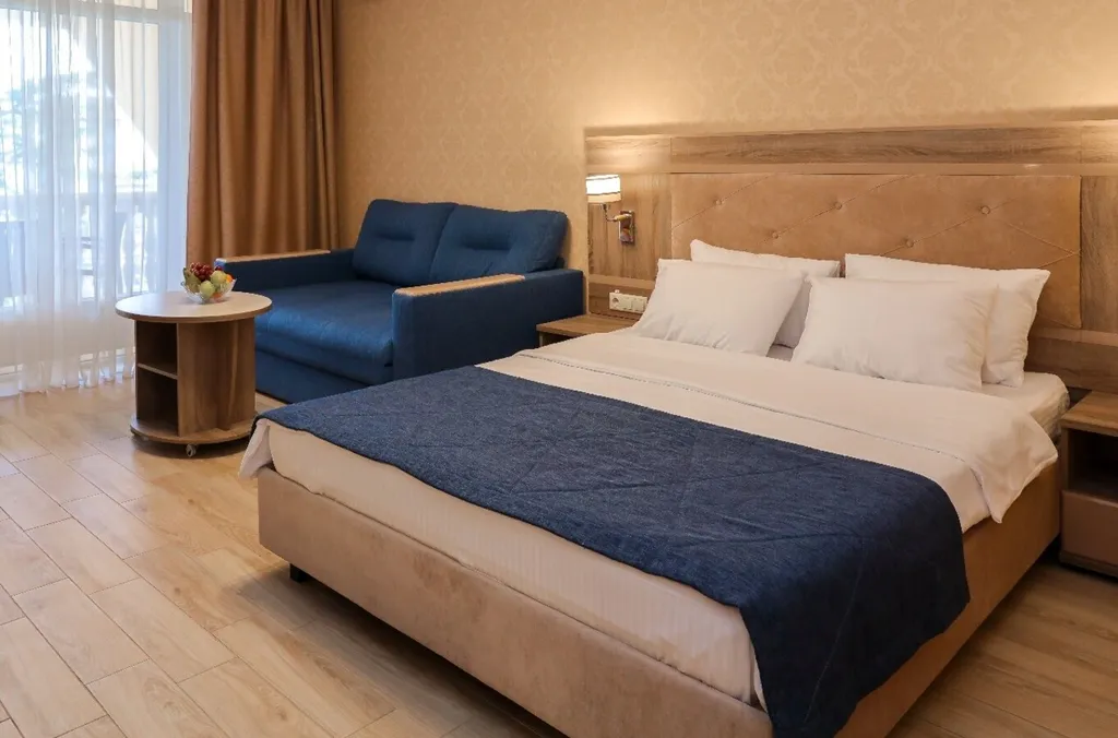 Размещение детей : До 3 лет бесплатно с 4-6 лет включительно 1000 руб. на доп месте с 7-12 лет включительно 1500 на доп месте. Полулюкс - уютный однокомнатный номер с балконом с видом на парк, который оборудован большой двуспальной кроватью и раскладным диваном.