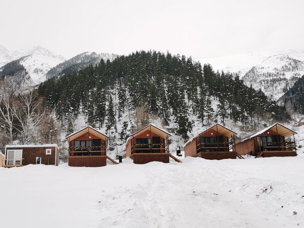 Уютные лоджии с панорамным видом на горы и лес, которые находятся в километре от центра поселка в тихом месте. До канатной дороги в поселке Романтик 10 км., для проезда можно воспользоваться услугами такси либо шатлом (в зимний сезон). К услугам гостей предоставляется баня на дровах, в которой могут с комфортом разместиться до 5 гостей. На территории есть мангалы для приготовления вкуснейшего шашлыка, с таким видом у каждого гостя просыпается талант шеф-повара. На веранде каждого домика стол с удобными стульями, не упустите возможность насладиться отличными видами. Для больших компаний на территории расположена комфортабельная беседка. В каждом номере есть все необходимое для комфортного проживания. К услугам гостей холодильник, чайник, микроволновая печь, телевизор, минимально необходимый набор посуды, чай, кофе. В двух часах неспешного подъема в гору находится водопад «Баритовый», по пути к которому можно заглянуть в пещеру. Данный маршрут могут преодолеть даже дети, для которых это