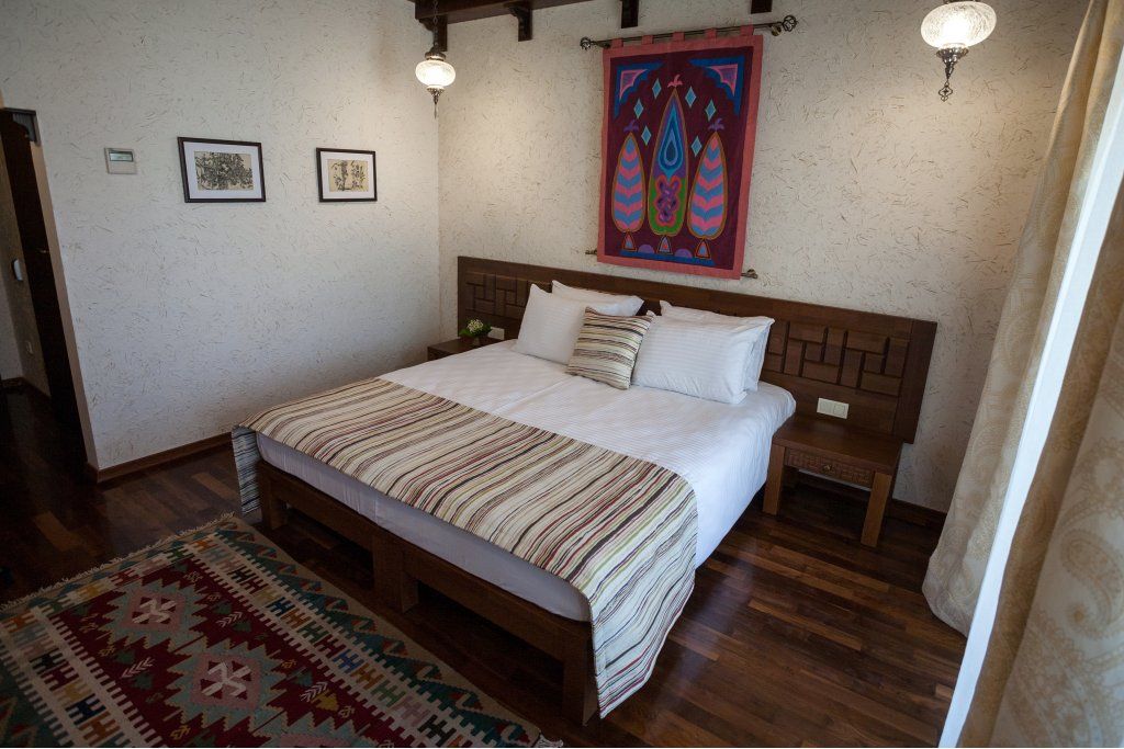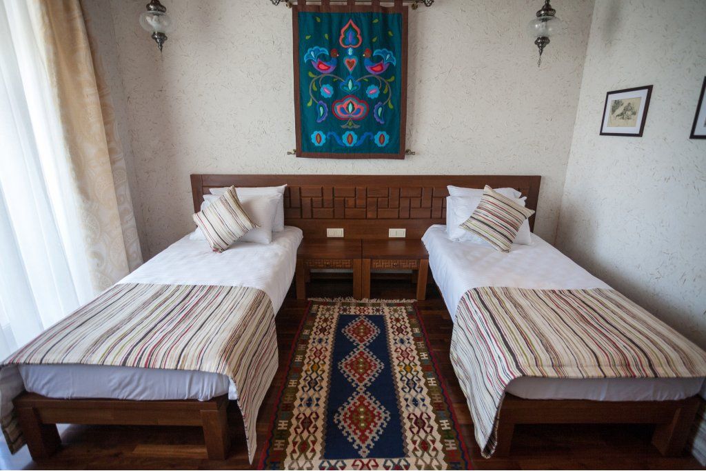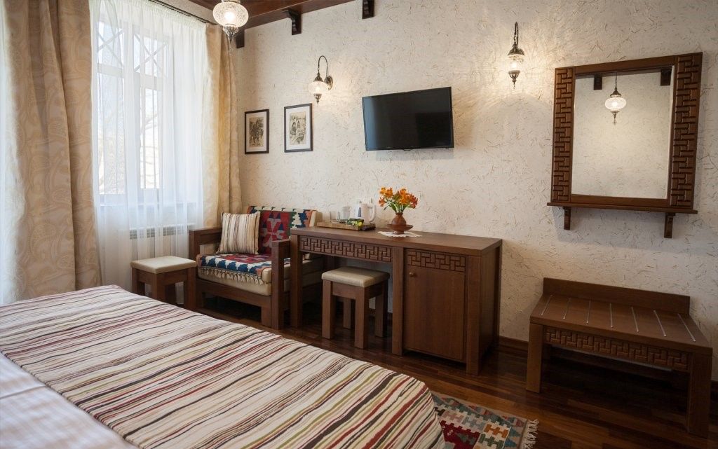 Уважаемые гости! Мы рады представить вам новый отель. На протяжении столетий наш город славился своим гостеприимством. В средневековом Кезлеве насчитывалось несколько десятков караван-сараев – постоялых дворов, где купцов и путешественников из разных стран всегда ждал ночлег и щедрый стол. Сегодня объединив лучшие многовековые традиции и самые высокие стандарты обслуживания, мы создали современный отель в уникальном этническом стиле. Расположившись в сердце Старого города на исторической площади Одун-базар в 5 минутах от моря, отель стал еще одной яркой гранью культурно-этнографического центра, включающего также музей крепостных ворот с уникальным макетом Кезлева, кофейни и этно-ресторан. Продолжая общую концепцию комплекса, экстерьер и интерьеры отеля выполнены в стиле дворцовой архитектуры времен Крымского ханства. В процессе его создания мы руководствовались 3 основными принципами: Этничность – культура коренного народа – уникальный рекреационный ресурс, востребованный украинскими