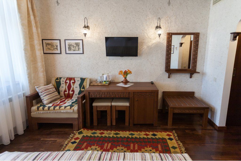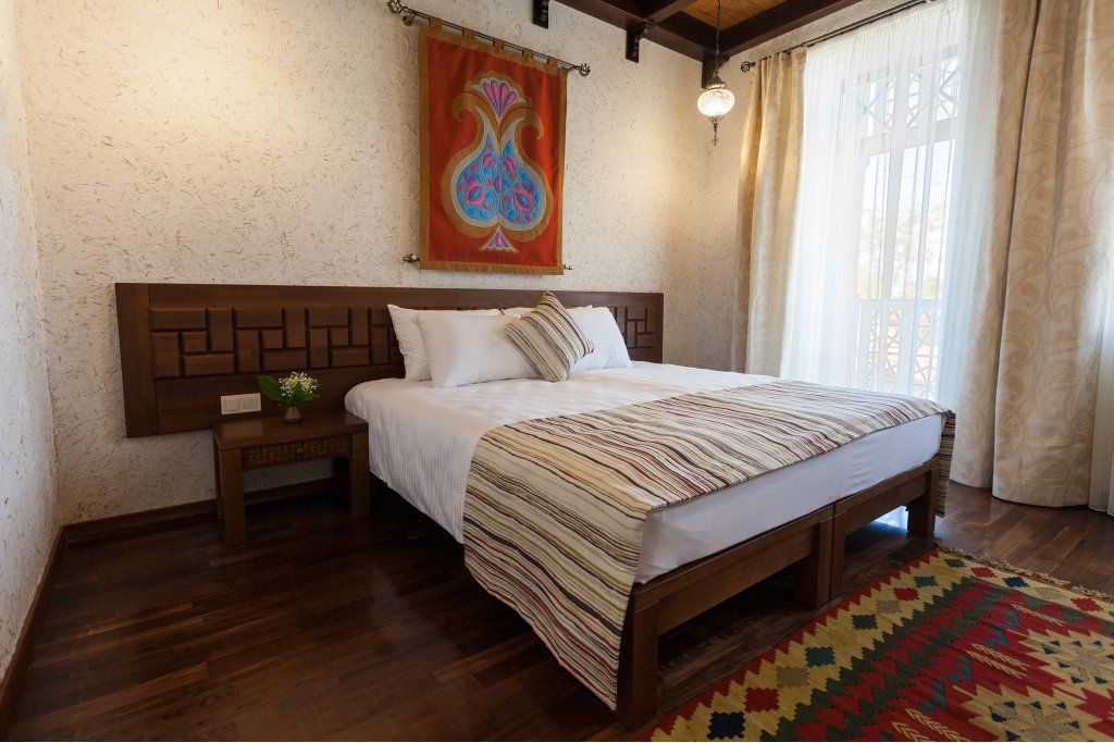 Уважаемые гости! Мы рады представить вам новый отель. На протяжении столетий наш город славился своим гостеприимством. В средневековом Кезлеве насчитывалось несколько десятков караван-сараев – постоялых дворов, где купцов и путешественников из разных стран всегда ждал ночлег и щедрый стол. Сегодня объединив лучшие многовековые традиции и самые высокие стандарты обслуживания, мы создали современный отель в уникальном этническом стиле. Расположившись в сердце Старого города на исторической площади Одун-базар в 5 минутах от моря, отель стал еще одной яркой гранью культурно-этнографического центра, включающего также музей крепостных ворот с уникальным макетом Кезлева, кофейни и этно-ресторан. Продолжая общую концепцию комплекса, экстерьер и интерьеры отеля выполнены в стиле дворцовой архитектуры времен Крымского ханства. В процессе его создания мы руководствовались 3 основными принципами: Этничность – культура коренного народа – уникальный рекреационный ресурс, востребованный украинскими