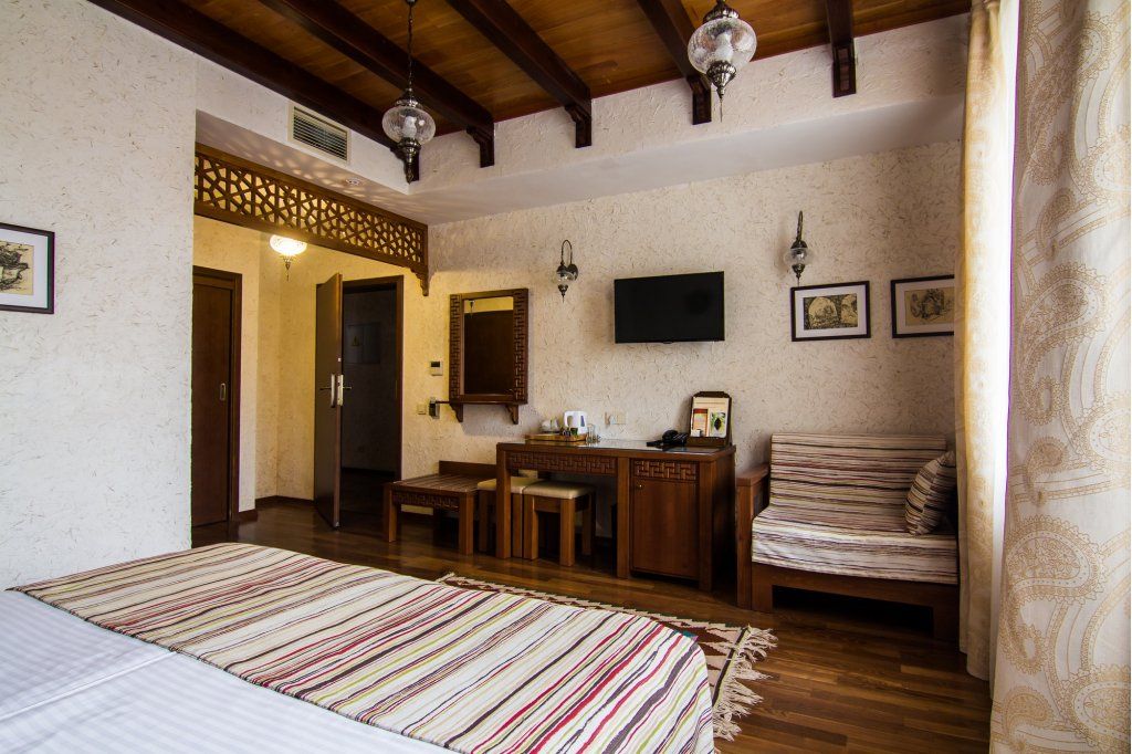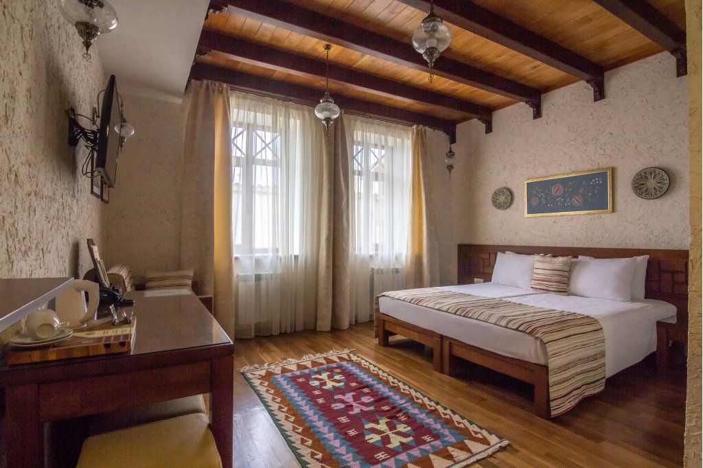 Уважаемые гости! Мы рады представить вам новый отель. На протяжении столетий наш город славился своим гостеприимством. В средневековом Кезлеве насчитывалось несколько десятков караван-сараев – постоялых дворов, где купцов и путешественников из разных стран всегда ждал ночлег и щедрый стол. Сегодня объединив лучшие многовековые традиции и самые высокие стандарты обслуживания, мы создали современный отель в уникальном этническом стиле. Расположившись в сердце Старого города на исторической площади Одун-базар в 5 минутах от моря, отель стал еще одной яркой гранью культурно-этнографического центра, включающего также музей крепостных ворот с уникальным макетом Кезлева, кофейни и этно-ресторан. Продолжая общую концепцию комплекса, экстерьер и интерьеры отеля выполнены в стиле дворцовой архитектуры времен Крымского ханства. В процессе его создания мы руководствовались 3 основными принципами: Этничность – культура коренного народа – уникальный рекреационный ресурс, востребованный украинскими