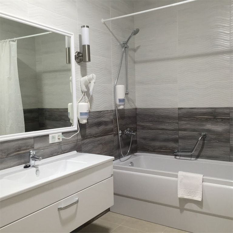 Наша гордость – аквапарк Что может быть лучше, чем в летний жаркий день погрузиться в чистую, прозрачную воду и получить массу развлечений для всей семьи? Аквапарк «Атлантида» – это самые длинные спуски в Крыму: 8 взрослых и 8 детских горок, туннельных и экстремальных. Волновой бассейн площадью 2 000 м2. Отдельная зона для самых маленьких – бассейн с подогреваемой водой. Вдоволь накатавшись, можно пообедать или поужинать в кафе европейской кухни, которое расположено на территории аквапарка. Ваши дети будут в восторге Для детворы идеальный отдых – это не экскурсии и достопримечательности, а игры, горки и бассейны. В «Атлантиде» лето с акцентом на активность и яркие эмоции. Пока родители наслаждаются крымским солнцем и коктейлем у бассейна, детвора скользит по горкам и играет под чутким присмотром профессиональной команды аниматоров. Отдых в аквапарке «Атлантида» – это компромисс для ребенка и родителей. Просторные номера оформлены в минималистичном европейском стиле. Приглушенная цвет