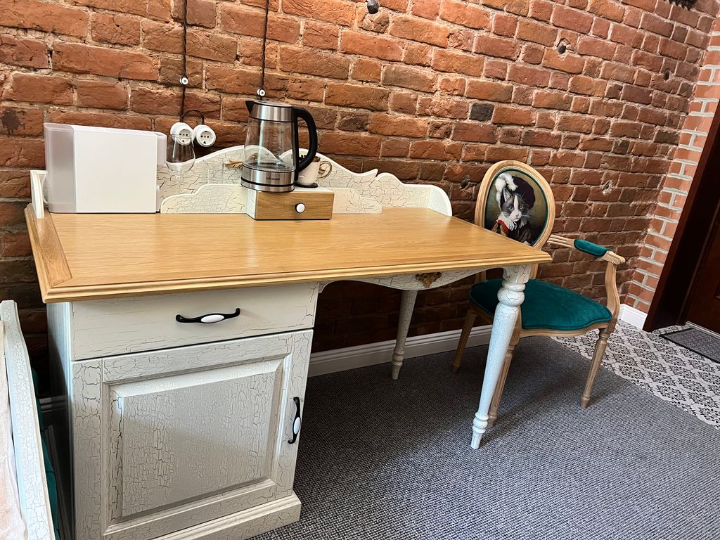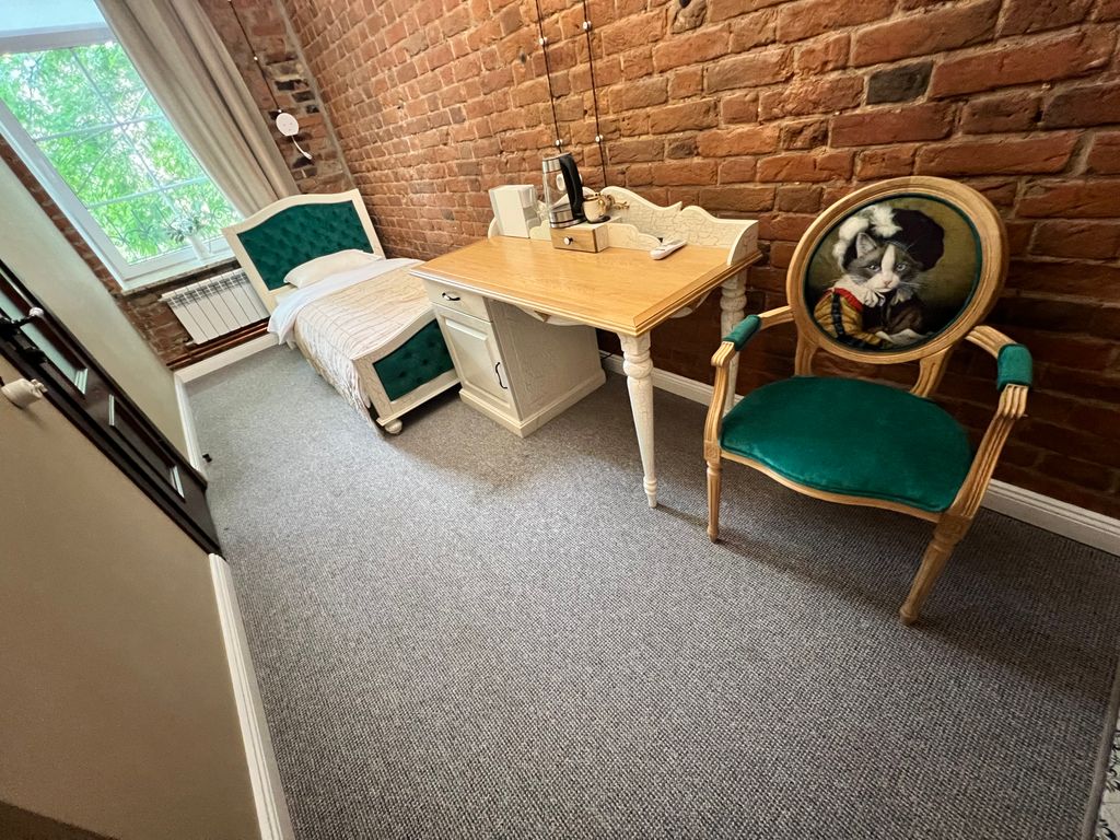 Одноместный номер с односпальной кроватью, расположенный на втором этаже с окном - вид во двор. Есть рабочий стол, ТВ, интернет, чайник, кофемашина, тапочки, комплект полотенец, косметические принадлежности.