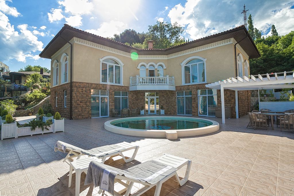 Гостевой дом в Ялте с видом на море и горы. Для гостей отдельный вход. Кухня: холодильник; микроволновая печь; посудомоечная машина индукционная плита; все кухонные принадлежности. Большая гостиная с большим обеденным столом. 4 номера с душем и туалетом, в номере мебель из натурального дерева, кондиционер, спутниковое ТВ. На территории крытая беседка с зоной барбекю и отдыха. Терраса 200 метров с видом на море. На террасе: бассейн; солярий; пергола с обеденной зоной. Большой подземный гараж.