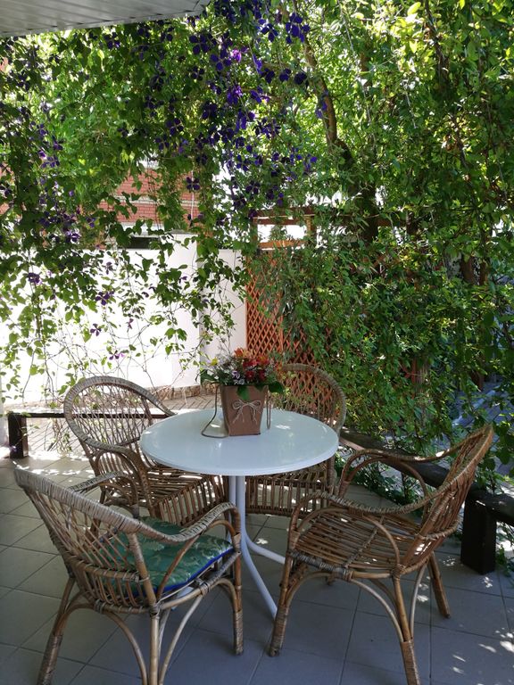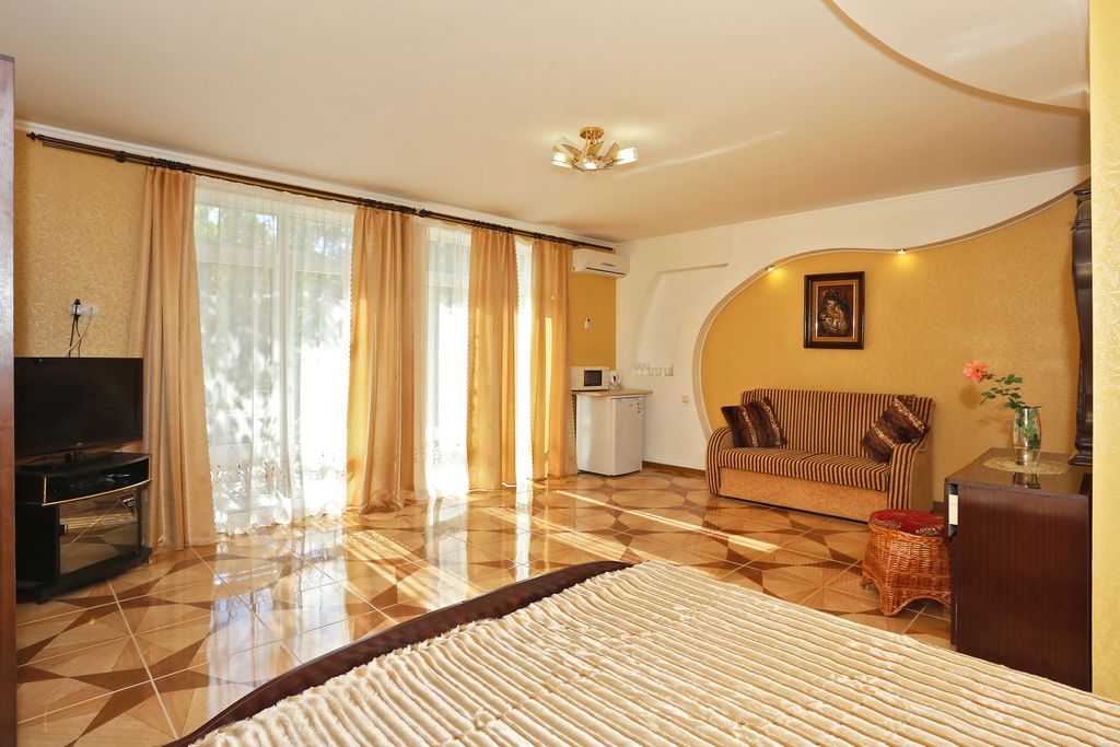 Гостевой дом расположен рядом с парковой зоной пансионата "голубой залив". Большая часть территории дома отдана под зеленую зону отдыха, где создан аромосад из редких растений, которые помогают оздоравливать организм. Большое количество беседок, как в классическом, так и в восточном стиле, дают возможность каждому гостю найти свой уголок. А общая кухня в необходимой комплектации приготовить что- либо самостоятельно. На территории, в дневное время, функционирует пруд с водопадом, где рыбки и черепашки порадуют не только детей, но и взрослых. В холле также установлены аквариумы с экзотическими рыбками. Для детей имеется батут.
