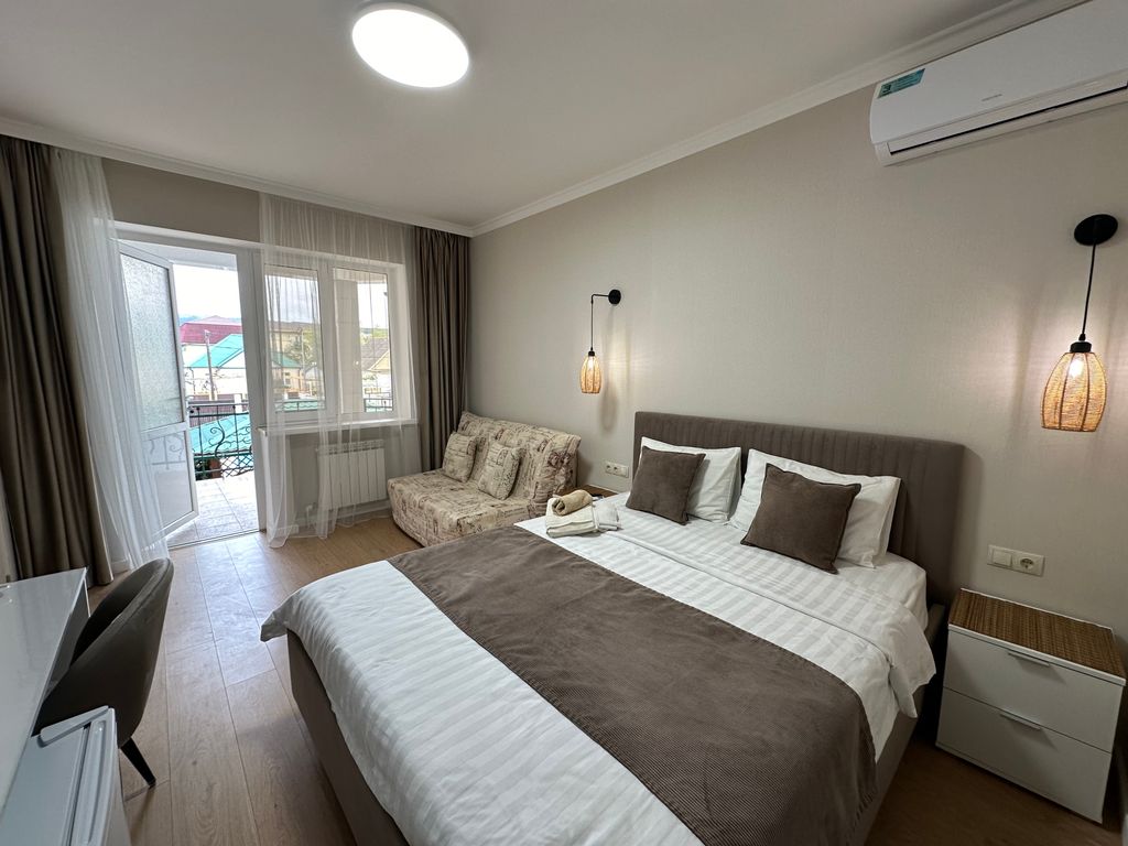 Вилла терраса приветствует дорогих гостей! Гостевой дом находится в тихом центре Геленджика. В шаговой доступности (менее 5 мин пешком) вся развитая инфраструктура: платные парковки, продуктовые магазины, аптеки, рынок, кафе, столовые, банки, остановка автотранспорта, парк аттракционов, торговые центры. Песчаный и галечный пляжи в шаговой доступности. Комфортабельные номера со всем необходимым: телевизор с плоским экраном, холодильник, кондиционер, санузел с душем. Все номера с выходом на террасу. Благоустроенная территория с водопадом, большой беседкой для отдыха, мангальной зоной(доплата)и спа бассейном с современной системой очистки воды путем электролиза. Бассейн оснащен системой подогрева воды в прохладный период. В период с 10. 11. 2024 г. По 20. 04 2025 г. На всей территории и в комнатах скоростной интернет (wi-fi). Есть оборудованная общая кухня, утюг, гладильная доска, стиральная машина. В гостевом доме есть апартаменты с собственной кухней, террасой и всем необходим для ком