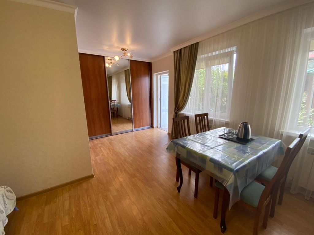 Вилла терраса приветствует дорогих гостей! Гостевой дом находится в тихом центре Геленджика. В шаговой доступности (менее 5 мин пешком) вся развитая инфраструктура: платные парковки, продуктовые магазины, аптеки, рынок, кафе, столовые, банки, остановка автотранспорта, парк аттракционов, торговые центры. Песчаный и галечный пляжи в шаговой доступности. Комфортабельные номера со всем необходимым: телевизор с плоским экраном, холодильник, кондиционер, санузел с душем. Все номера с выходом на террасу. Благоустроенная территория с водопадом, большой беседкой для отдыха, мангальной зоной(доплата)и спа бассейном с современной системой очистки воды путем электролиза. Бассейн оснащен системой подогрева воды в прохладный период. В период с 10. 11. 2024 г. По 20. 04 2025 г. На всей территории и в комнатах скоростной интернет (wi-fi). Есть оборудованная общая кухня, утюг, гладильная доска, стиральная машина. В гостевом доме есть апартаменты с собственной кухней, террасой и всем необходим для ком