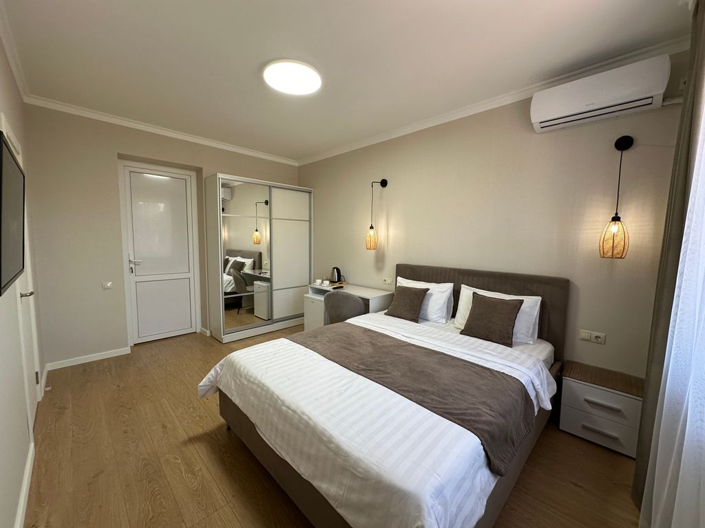 Вилла терраса приветствует дорогих гостей! Гостевой дом находится в тихом центре Геленджика. В шаговой доступности (менее 5 мин пешком) вся развитая инфраструктура: платные парковки, продуктовые магазины, аптеки, рынок, кафе, столовые, банки, остановка автотранспорта, парк аттракционов, торговые центры. Песчаный и галечный пляжи в шаговой доступности. Комфортабельные номера со всем необходимым: телевизор с плоским экраном, холодильник, кондиционер, санузел с душем. Все номера с выходом на террасу. Благоустроенная территория с водопадом, большой беседкой для отдыха, мангальной зоной(доплата)и спа бассейном с современной системой очистки воды путем электролиза. Бассейн оснащен системой подогрева воды в прохладный период. В период с 10. 11. 2024 г. По 20. 04 2025 г. На всей территории и в комнатах скоростной интернет (wi-fi). Есть оборудованная общая кухня, утюг, гладильная доска, стиральная машина. В гостевом доме есть апартаменты с собственной кухней, террасой и всем необходим для ком