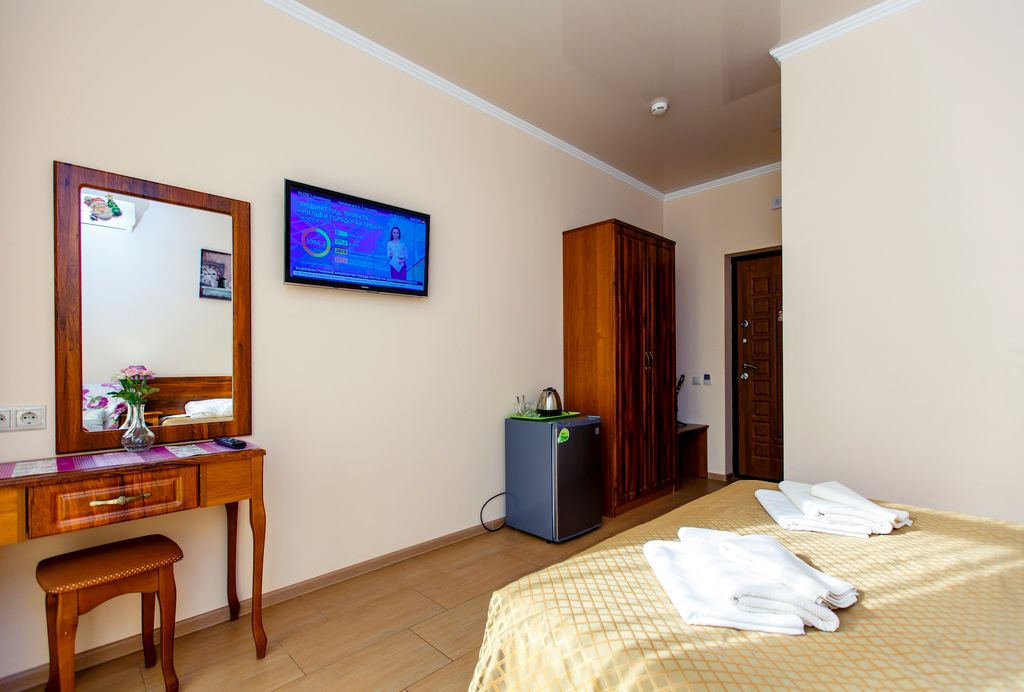 Гостевой дом по улице Тельмана, 23 находится в самом сердце черноморского курорта, вдали от шумных улиц. Здесь можно с головой окунуться в курортную атмосферу, забыв о домашних хлопотах. Современная мини-гостиница построена в 2012 году. К вашим услугам комфортабельные номера категории: стандарт, полулюкс и люкс. Каждый номер гостевого дома оформлен в современном стиле и оснащен телевизором с плоским экраном. Во всех номерах есть чайник и холодильник. Гости могут воспользоваться оборудованной общей кухней с необходимой посудой, чтобы приготовить блюда, или найти кафе в 5-ти минутах ходьбы от отеля. Дорога к морю займет не более пяти минут, так как гостевой дом расположен всего в 500 м от набережной с песочным пляжем. Рядом находится аквапарк "Дельфин". Бесплатная парковка около гостиницы под видео наблюдением (необходим предварительный заказ). Благодаря Wi-Fi интернету вы всегда будете на связи с друзьями и родными. В 2016 г. открыт новый корпус с комфортабельными номерами с