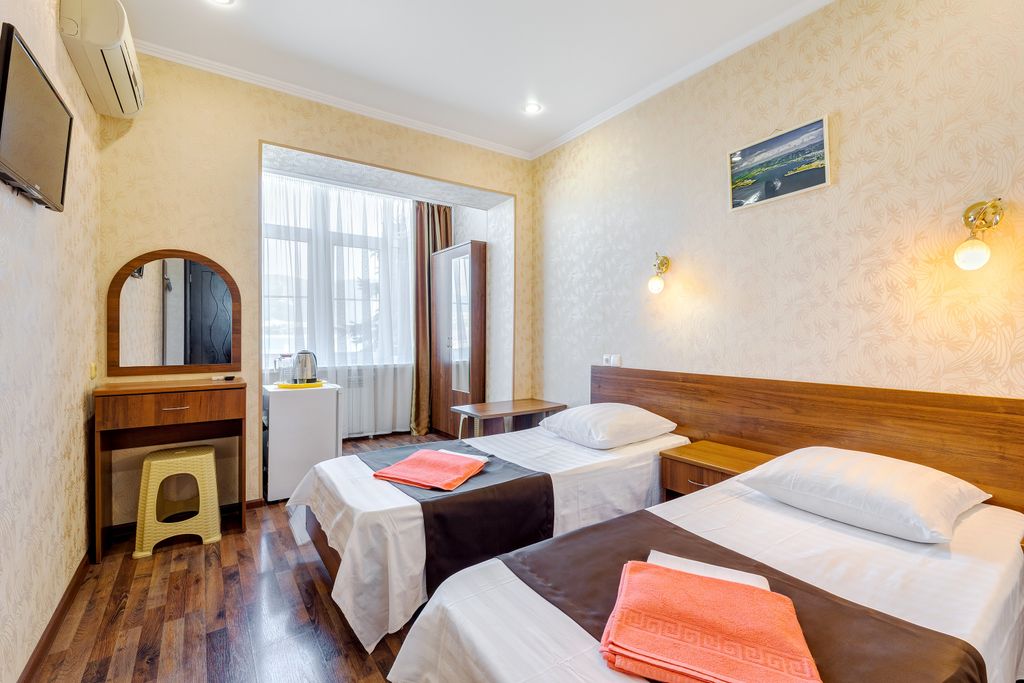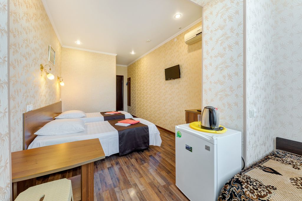 В городском районе Геленджика Тонкий мыс, в уютном, дворе с озеленением, беседками, мангалами, расположены: - трёхэтажный, с девятью комнатами категории стандарт различной площадью с видами на море и горы и в сад, в том числе: 6 двухместных комнат от 14 до 18 м2, одна трёхместная - 20 м2, одна четырёхместная — 30 м2, все оборудованы современными мебельными гарнитурами, ЖК телевизорами, холодильниками, сплит-системами. Санузлы в каждой комнате оборудованы унитазами, раковинами и небольшими ваннами; - оборудованный жилой цокольный этаж ; - отдельно стоящий двухэтажный двухкомнатный кирпичный дом, площадь каждой комнаты которого по 14 м2 + для каждой комнаты террасы по 12 м2с видом на море. Каждая оборудована мебельным гарнитуром, сплит-системой, ЖК телевизором и холодильником, санузлом; - второй отдельно стоящий дом 29м2 с одной четырёхместной комнатой, раздельным санузлом, ме