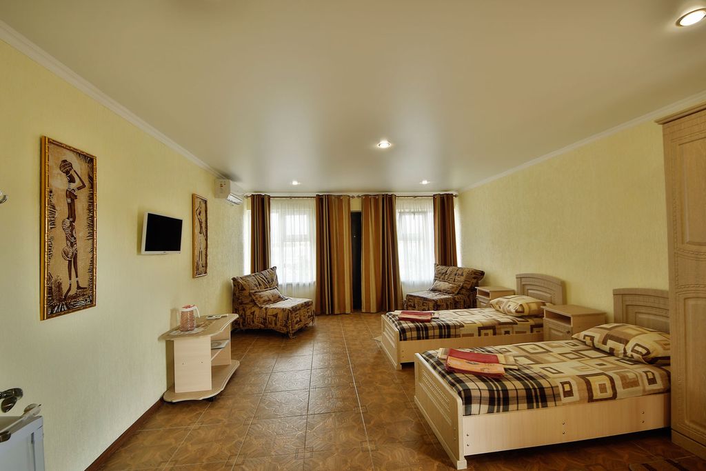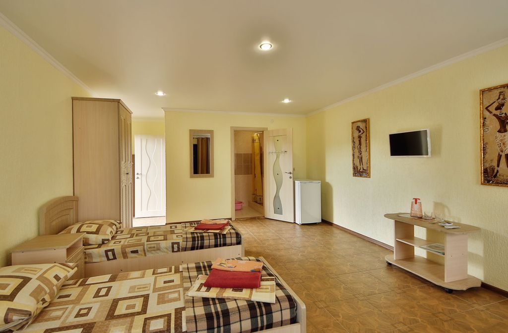В городском районе Геленджика Тонкий мыс, в уютном, дворе с озеленением, беседками, мангалами, расположены: - трёхэтажный, с девятью комнатами категории стандарт различной площадью с видами на море и горы и в сад, в том числе: 6 двухместных комнат от 14 до 18 м2, одна трёхместная - 20 м2, одна четырёхместная — 30 м2, все оборудованы современными мебельными гарнитурами, ЖК телевизорами, холодильниками, сплит-системами. Санузлы в каждой комнате оборудованы унитазами, раковинами и небольшими ваннами; - оборудованный жилой цокольный этаж ; - отдельно стоящий двухэтажный двухкомнатный кирпичный дом, площадь каждой комнаты которого по 14 м2 + для каждой комнаты террасы по 12 м2с видом на море. Каждая оборудована мебельным гарнитуром, сплит-системой, ЖК телевизором и холодильником, санузлом; - второй отдельно стоящий дом 29м2 с одной четырёхместной комнатой, раздельным санузлом, ме