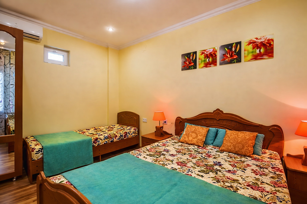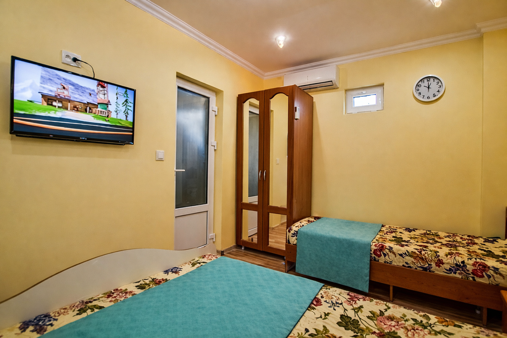 Гостевой дом находится недалеко от центра Кабардинки (5 минут ходьбы). До моря 10-12 минут пешком через рынок, центр, -магазины и кафе. Дороги асфальтированы и освещаются. К услугам гостей просторные, современные номера с новой качественной мебелью и сантехникой. Все номера с удобствами, в каждом номере спутниковое ТВ, общие кухни на каждом этаже, общая гладильная комната. Но главное достоинство ВИталии — это прекрасная просторная и очень зелёная территория с детской площадкой, качелями для детей, турником и песочницей. Для каждого номера предусмотрено место для отдыха на просторной веранде в тени и зелени с видом на розарий и фонтанчик.