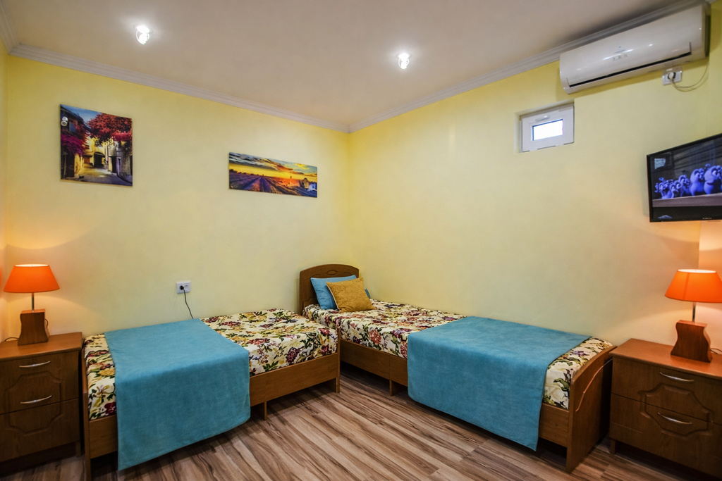 Гостевой дом находится недалеко от центра Кабардинки (5 минут ходьбы). До моря 10-12 минут пешком через рынок, центр, -магазины и кафе. Дороги асфальтированы и освещаются. К услугам гостей просторные, современные номера с новой качественной мебелью и сантехникой. Все номера с удобствами, в каждом номере спутниковое ТВ, общие кухни на каждом этаже, общая гладильная комната. Но главное достоинство ВИталии — это прекрасная просторная и очень зелёная территория с детской площадкой, качелями для детей, турником и песочницей. Для каждого номера предусмотрено место для отдыха на просторной веранде в тени и зелени с видом на розарий и фонтанчик.