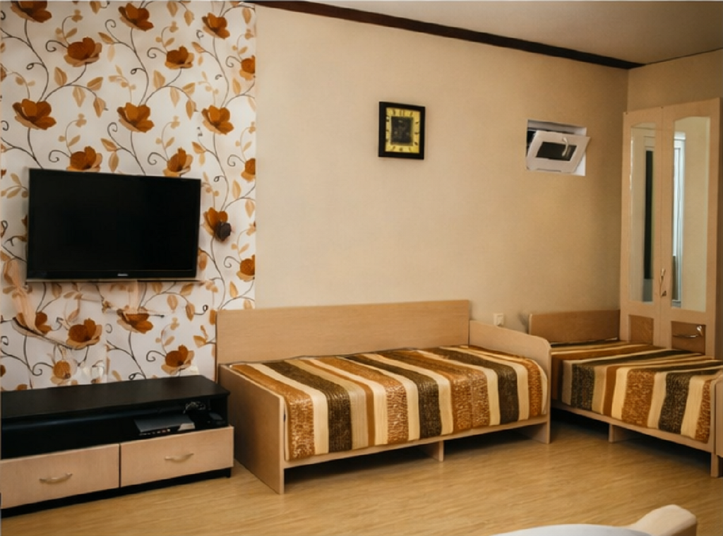 Гостевой дом находится недалеко от центра Кабардинки (5 минут ходьбы). До моря 10-12 минут пешком через рынок, центр, -магазины и кафе. Дороги асфальтированы и освещаются. К услугам гостей просторные, современные номера с новой качественной мебелью и сантехникой. Все номера с удобствами, в каждом номере спутниковое ТВ, общие кухни на каждом этаже, общая гладильная комната. Но главное достоинство ВИталии — это прекрасная просторная и очень зелёная территория с детской площадкой, качелями для детей, турником и песочницей. Для каждого номера предусмотрено место для отдыха на просторной веранде в тени и зелени с видом на розарий и фонтанчик.