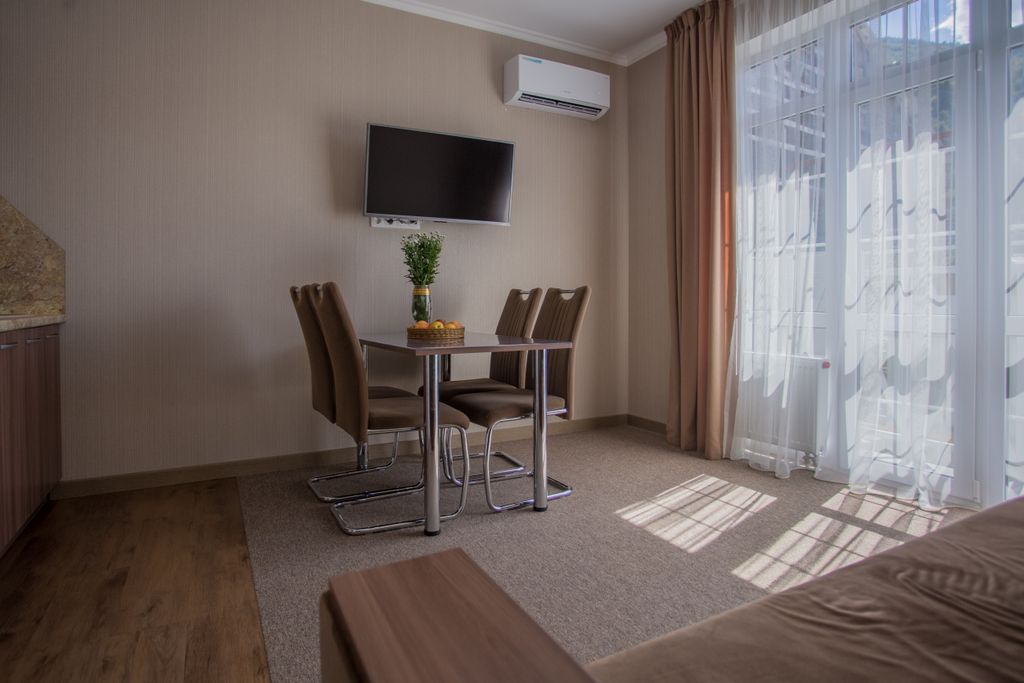 Гостевой дом «Гости» расположен в поселке Красная Поляна, на высоте 540 м над уровнем моря. До горнолыжных подъемников 5-7 км. До курорта «Красная Поляна» — «Горная Карусель» 5 км., курорта «Роза Хутор» 7 км., курорта «Газпром» и «Альпика» 6 км. До Черного моря и Имеретинской набережной 42 км., Олимпийского парка и Сочи Парка 39 км. До аэропорта Сочи 35 км. Есть бесплатная парковка для автомобилей. Удобная транспортная развязка. Организован трансфер для гостей. В 50 метрах магазин «Магнит» и кафе-пиццерия. В 200 метрах от нас есть автобусная остановка. У нас несколько категорий комфортабельных апартаментов, вместимостью от 1 до 5 гостей. Все апартаменты оборудованы кухней с необходимой посудой. Во всех апартаментах предоставляется постельное бельё, полотенца, мыло, шампунь-гель для душа, тапочки, фен, гель для мытья посуды. По запросу гостей предоставляется детская кроватка. Стиральная машинка в общем пользовании. Бассейн с подогревом на открытом воздухе, мангал и принадлежности для ба