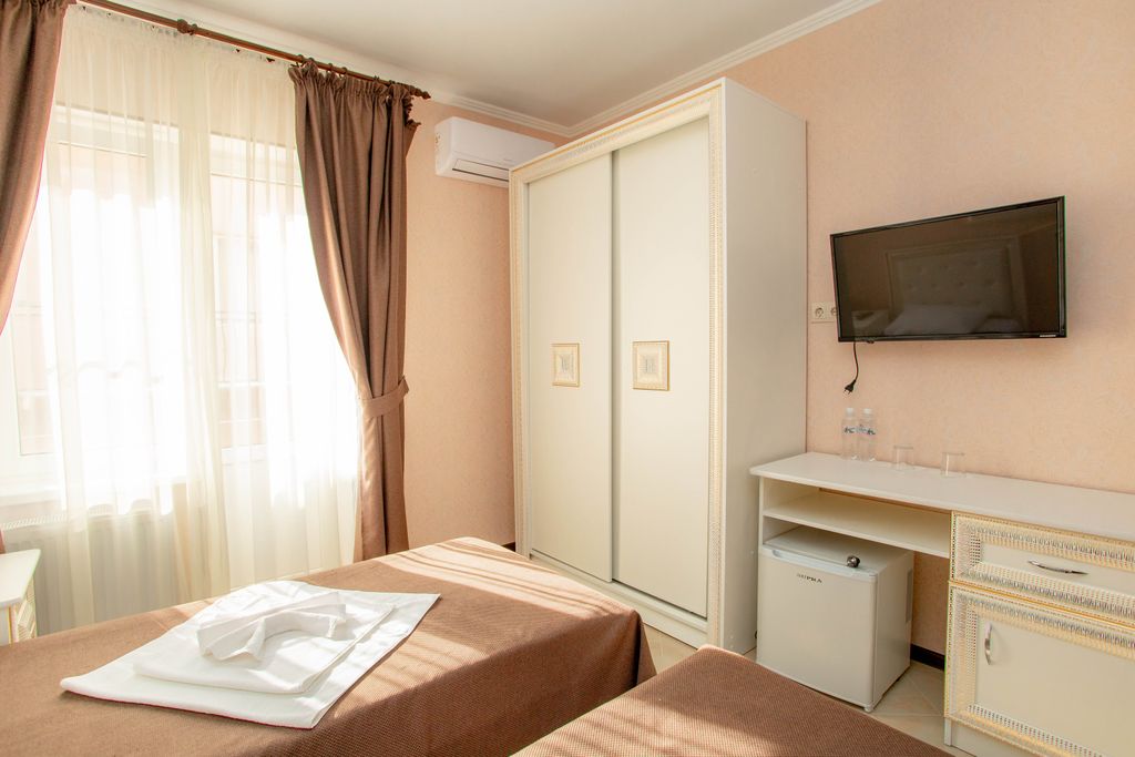 Гостиница "императоръ" находится в п. Витязево в 900 метрах от черного моря и в 500 метрах от центра развлечения "паралия". На "паралии" есть все: бары, рестораны, дискотеки, парк развлечения, аквапарк "олимпия", дельфинарий "немо", океанариум,, прогулочная зона. Наш пляж песочный и вода в море с постепенным углублением. Гостиница новая, красивая с прекрасным дизайном. Видеонаблюдение в общественных зонах и на улице, сделает ваш отдых спокойным в нашей гостинице. На 4 этаже на крыше находится большая терраса для загара с шезлонгами, уличной мебелью, и там открывается вид на все витязево. Наш персонал очень приветливый и мы всегда любые возникшие вопросы решаем максимально быстро. Все это делает пребывание в отеле уютным и комфортным, а обстановку - домашней. На 1 этаже находится просторная кухня для самостоятельного приготовления, где есть все необходимое. Для наших гостей на территории есть большая парковка для машин. До аэропорта и