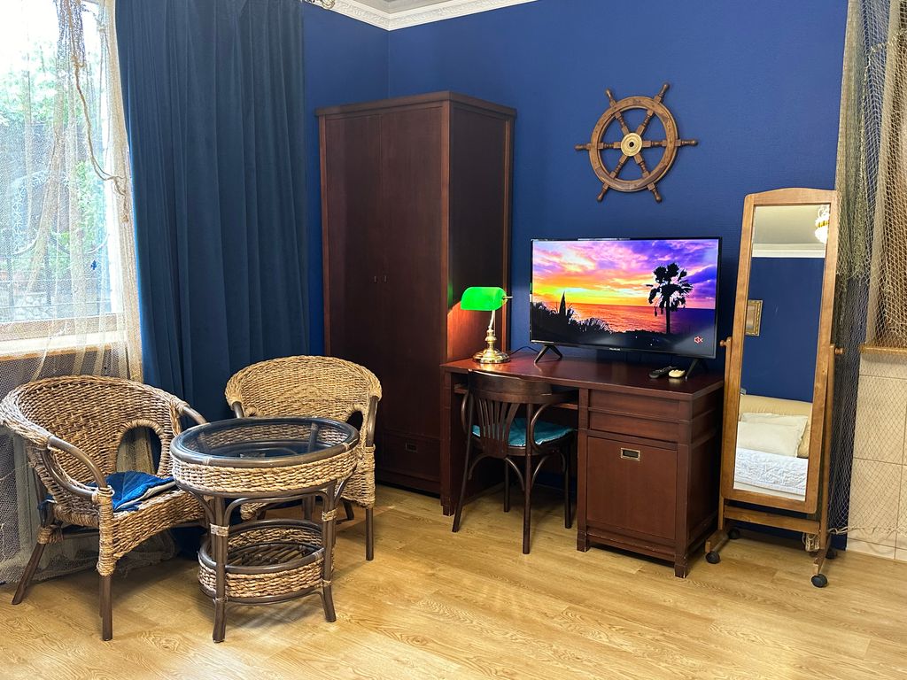 В нашем доме 10 комнат-кают, оформленных в морском стиле с экзотическими корабельными аксессуарами. Зимой у нас тепло (работает газовое отопление), летом — не жарко (в каждой комнате кондиционер). В каждой каюте есть полноценная кухня, оснащённая всей необходимой техникой и посудой для приготовления и приёма пищи. На заднем дворе расположена уютная площадка для отдыха на свежем воздухе. Площадка оборудована мебелью и зоной барбекю. Здесь вы сможете самостоятельно приготовить плов, уху, шурпу и пожарить вкусный шашлык! Наши сервисы: Бесплатный беспроводной доступ к интернету Wi-Fi. Пляжные полотенца и подстилки. Пользование мангалом. Детская кроватка и детский стульчик по запросу. Утюг, гладильная доска. Дополнительные сервисы: Размещение питомца миниатюрной породы до 5 кг — 400 рублей в сутки. Прокат велосипедов. 150 рублей час или 500 рублей день. Мы с радостью принимаем на отдых деток любого возраста. На территории гостевого дома имеются площадки для детских игр с качелями,