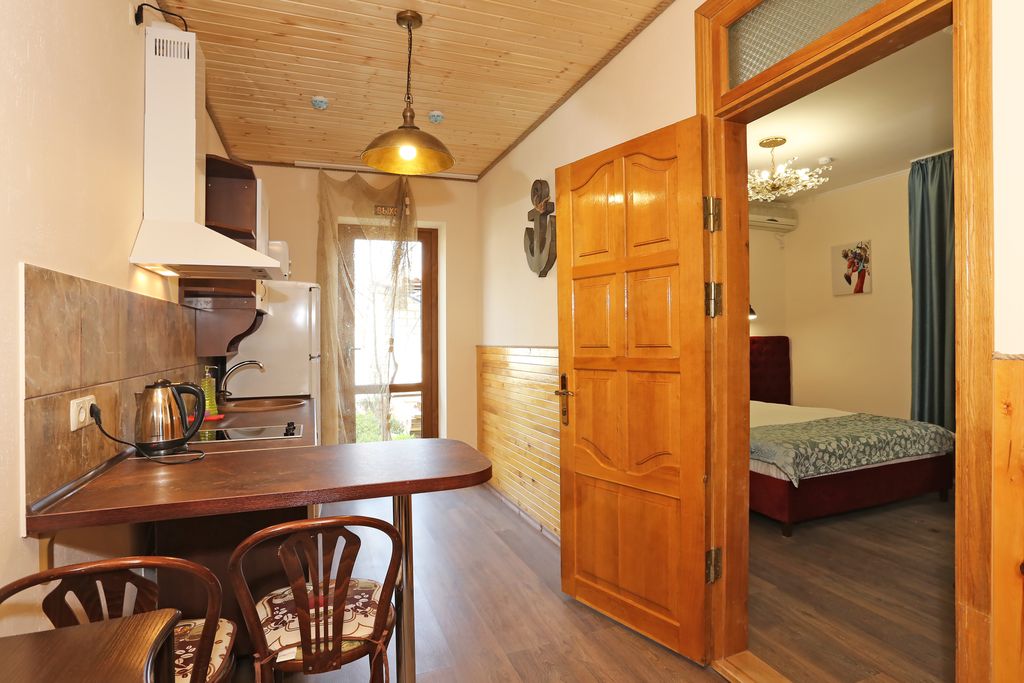В нашем доме 10 комнат-кают, оформленных в морском стиле с экзотическими корабельными аксессуарами. Зимой у нас тепло (работает газовое отопление), летом — не жарко (в каждой комнате кондиционер). В каждой каюте есть полноценная кухня, оснащённая всей необходимой техникой и посудой для приготовления и приёма пищи. На заднем дворе расположена уютная площадка для отдыха на свежем воздухе. Площадка оборудована мебелью и зоной барбекю. Здесь вы сможете самостоятельно приготовить плов, уху, шурпу и пожарить вкусный шашлык! Наши сервисы: Бесплатный беспроводной доступ к интернету Wi-Fi. Пляжные полотенца и подстилки. Пользование мангалом. Детская кроватка и детский стульчик по запросу. Утюг, гладильная доска. Дополнительные сервисы: Размещение питомца миниатюрной породы до 5 кг — 400 рублей в сутки. Прокат велосипедов. 150 рублей час или 500 рублей день. Мы с радостью принимаем на отдых деток любого возраста. На территории гостевого дома имеются площадки для детских игр с качелями,