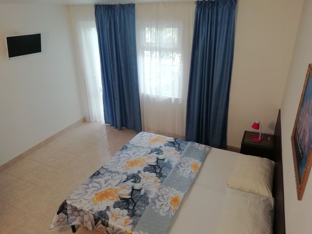 2х,3х,4х местные номера. В каждом номере удобства: санузел с душем, телевизор, холодильник, сплит-система. Уютный дворик , бассейн, бесплатный Wi-Fi интернет, автостоянка, имеется общая кухня со всем необходимым для приготовления и приёма пищи (посуда и две 4-х конфорочные плиты). Гостиница расположена в 15 мин. ходьбы от моря, пляж песчаный. В нескольких минутах ходьбы от гостинцы расположен: развлекательный центр Витязево с многочисленными барами, магазинами, ресторанами, кафе, дискотеками, парком аттракционов, где Вы можете прекрасно поесть, отдохнуть и повеселиться, однако не настолько близко, что бы вашему комфортному отдыху не мешал посторонний шум в вечерние время суток