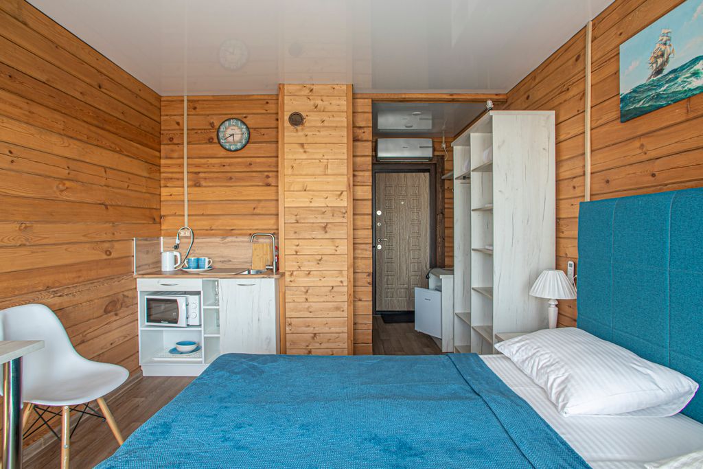 В нашем гостевом доме "Крымское поместье" в Севастополе, деревянном, из настоящего соснового бруса, всего 6 студий. В каждой отдельный вход с террасы, панорамное окно и балкон с видом на море и легендарный город. В студии есть все необходимое для комфортного проживания: мебель, кухонная зона (холодильник, чайник, микроволновка, посуда), санузел с душевой кабиной, постельное белье и полотенца. Для тепла и уюта в каждой студии - инверторный кондиционер и потолочный инфракрасный обогреватель в санузле. И в помещениях и на территории отличный Wi-Fi, ТВ ( 28 каналов). Есть бытовое помещение со стиральной машиной, утюгом и гладильной доской. У входа в каждый номер - настенная сушилка для купальников и полотенец, очень удобно в летний сезон. Возможно бесконтактное заселение в любое время и быстрое предоставление отчетных документов. У нас ухоженная территория с автопарковкой и видеонаблюдением, мангальной площадкой, качелями и скамейками, без посторонних, только