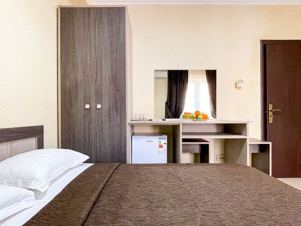 В нашем отеле теплый подогреваемый бассейн +28 градусов. Отель расположен в шаговой доступности (900 метров или 10 минут ходьбы) от белоснежных песчаных пляжей. К услугам гостей: комфортабельные номера со всеми удобствами, большой бассейн с шезлонгами, большая просторная территория, детская площадка, батут, ежедневная детская анимация, недорогая столовая, мангал. Вся социальная и развлекательная инфраструктура в шаговой доступности: аквапарк, дельфинарий, парк аттракционов, множество магазинов, рынок и супермаркет. Для юных туристов бесплатно - анимация, детская площадка, батут, дневные развивающие и игровые программы, вечерняя дискотека и пенные вечеринки, а также детские кроватки, прогулочные коляски, стульчики для кормления, ванночки, горшки и т.д. Цены умеренные. В межсезонье с конца сентября до конца мая бассейн, анимация и столовая не функционируют.
